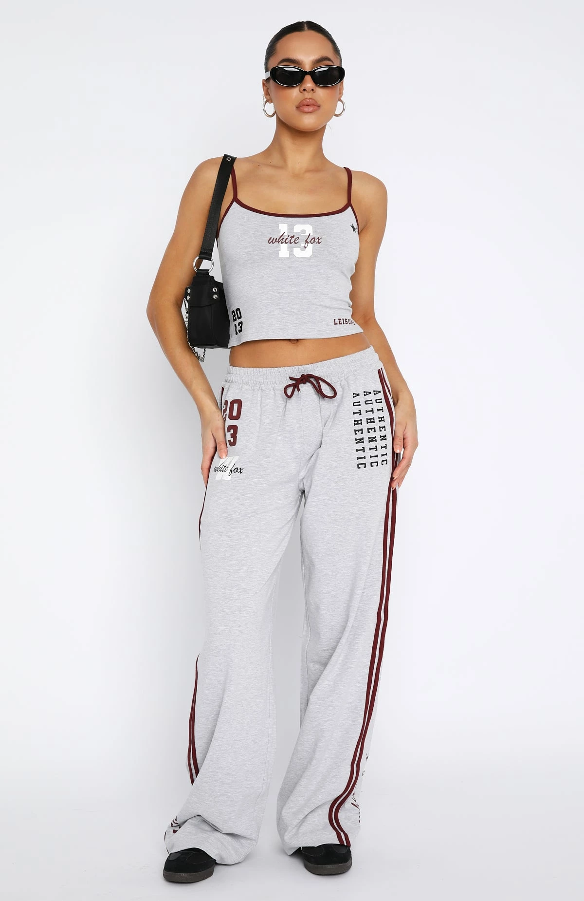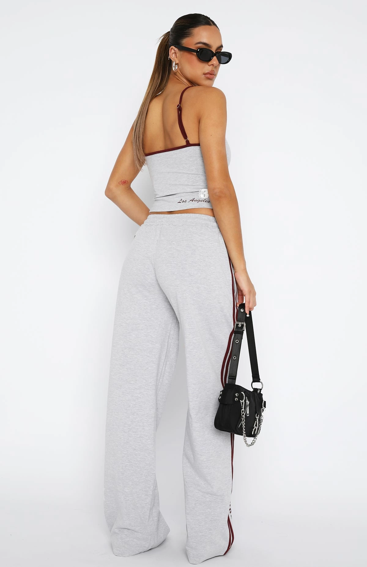 Athletic in shape, relaxed in style. The All Star Season Track Pants Grey Marle features a thick waist and drawstring, printed logo front side, taping detail on the side, high rise fit and soft, unlined fabric. Pair with the matching All Star Season Baby Tee Grey Marle for a chic and sporty look!