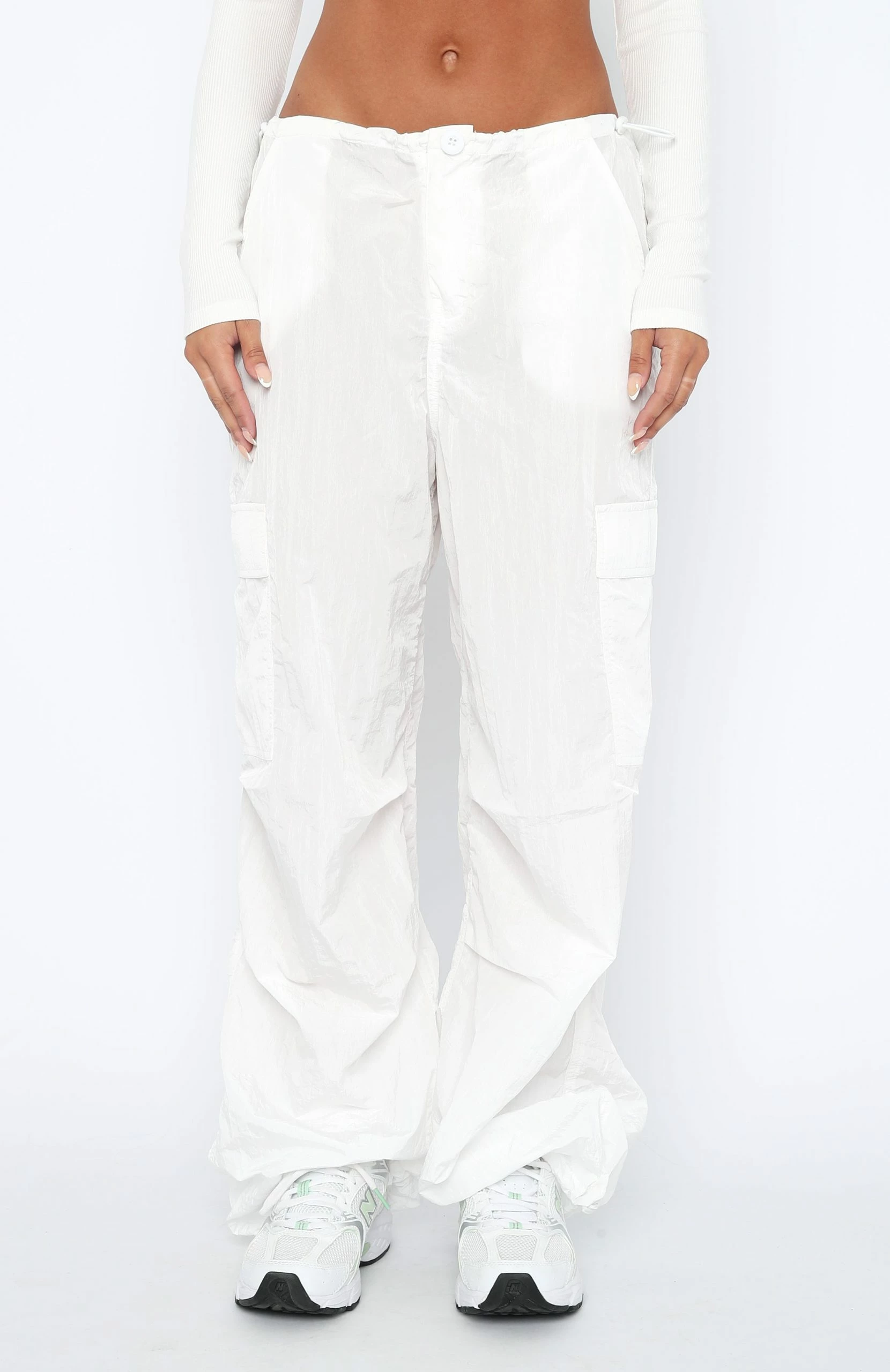 Parachute pants are our current obsession and we are living in the Be The Moment Cargo Pants in White. Featuring a parachute pant design and a wide leg fit, button closure, side and cuff drawstring with toggle, back and side pocket design and lightweight fabric. Pair these parachute pants with a long sleeve top and sneakers for a super chic look.