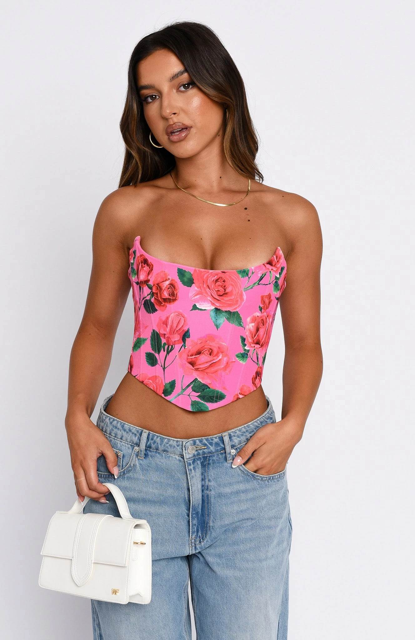 Get ready to fall head over heels with the Begin Again Bustier in Pink Roses. This strapless bustier features boning in bodice, zipper centre back and lined fabric. Complete the look with your favourite pair of White Fox Denim Jeans and clear mules for a look we love!