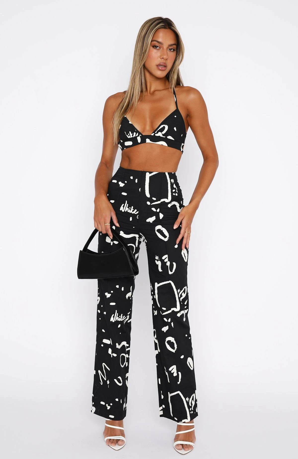 Scribble finding an outfit off your to-do list with the Better Without You Crop in Black Scribble. This crop features halter neck style with thin straps, plunge neckline, cross-over back design and lined fabric. Pair with the matching If You Only Knew Pants and clear mules for a look White Fox Angels Love!