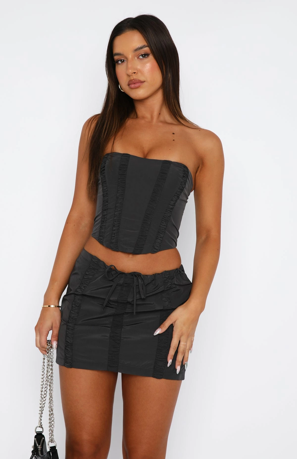 The Between The Lines Bustier in Black gives us ALL the vibes. This bustier features grip tape, boning in bodice, zipper centre back, ruched front detail and lined fabric. Complete the set with the matching Come Alive Mini Skirt and perspex heels for a look we are obsessed with!