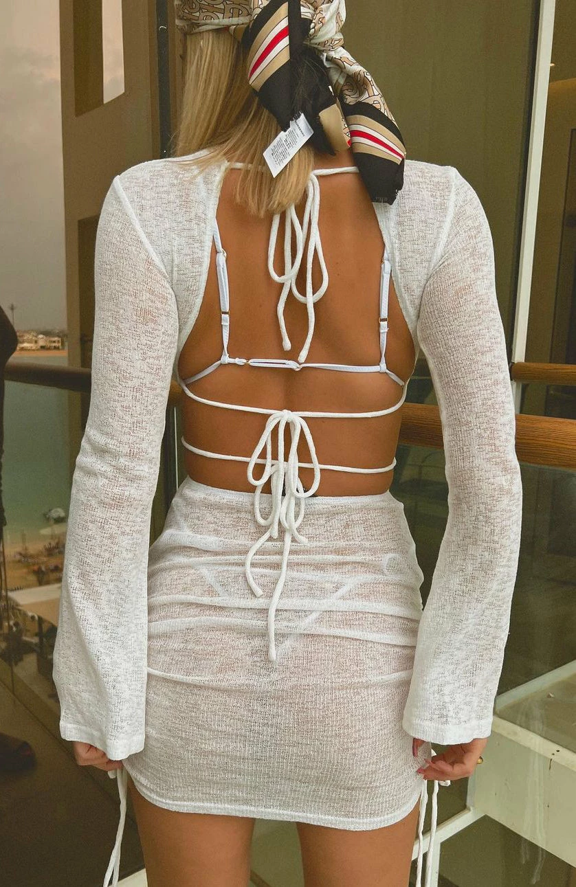 Whether you are relaxing on the sand or sipping cocktails by the pool the Wear the Break Free Mini Dress in White is essential. Featuring long sleeves, cut out midriff, backless design with tie detail, high scooped neckline, double drawstring ruching on the sides/cuffs and sheer, lightweight fabric.