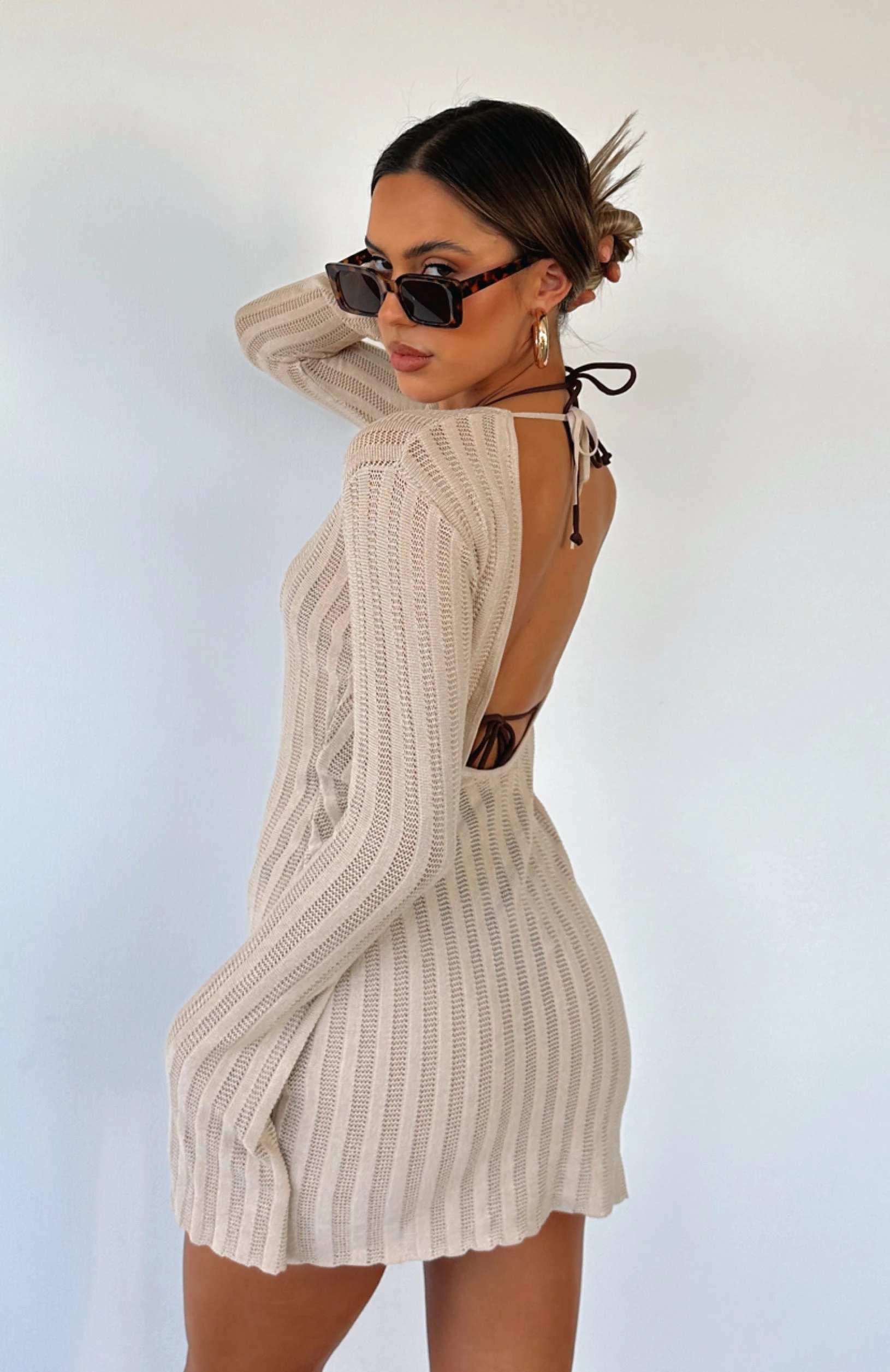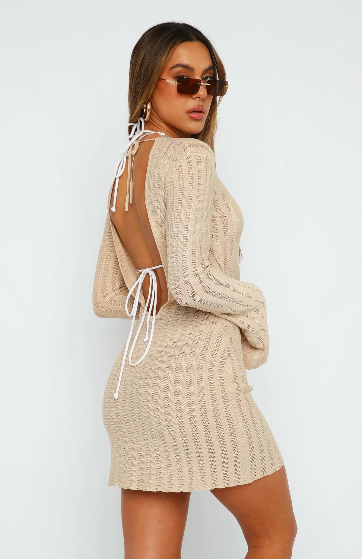 Show off your glow with this Crowded Room Mini Dress Beige. Featuring long sleeves, backless design with back adjustable tie-up detail and sheer, lightweight fabric. Pair over your favourite White Fox Bikini and platform slides for a look we love!