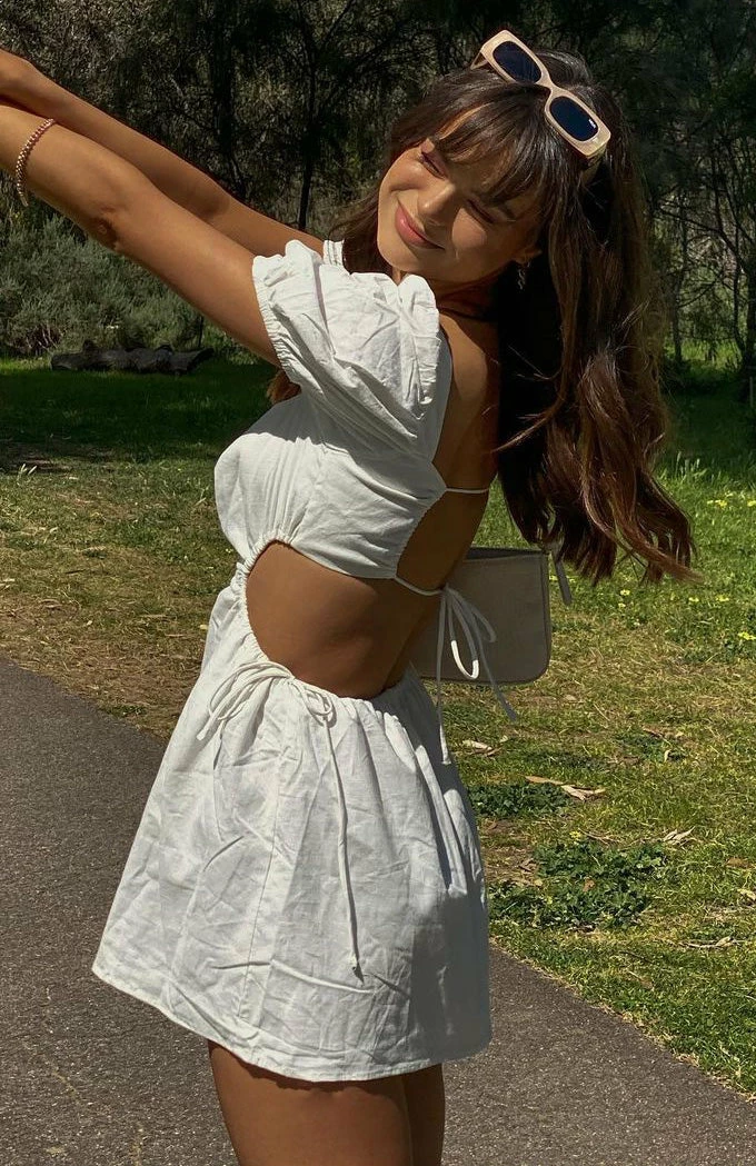 Nail the trend with this super cute dress this season. The Different Girl Mini Dress in White features puff sleeves, square neckline, elasticated waist band, cut out waist, lined and backless design with ties. Team this with heeled mules and a cute shoulder bag for a brunch date with the dolls.