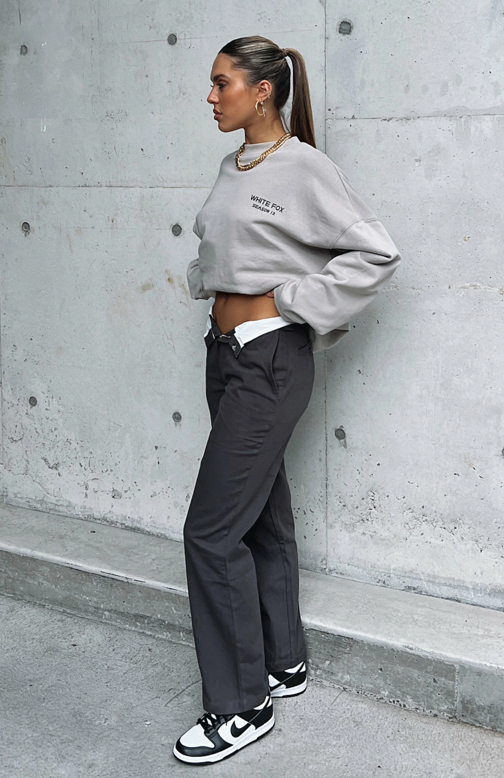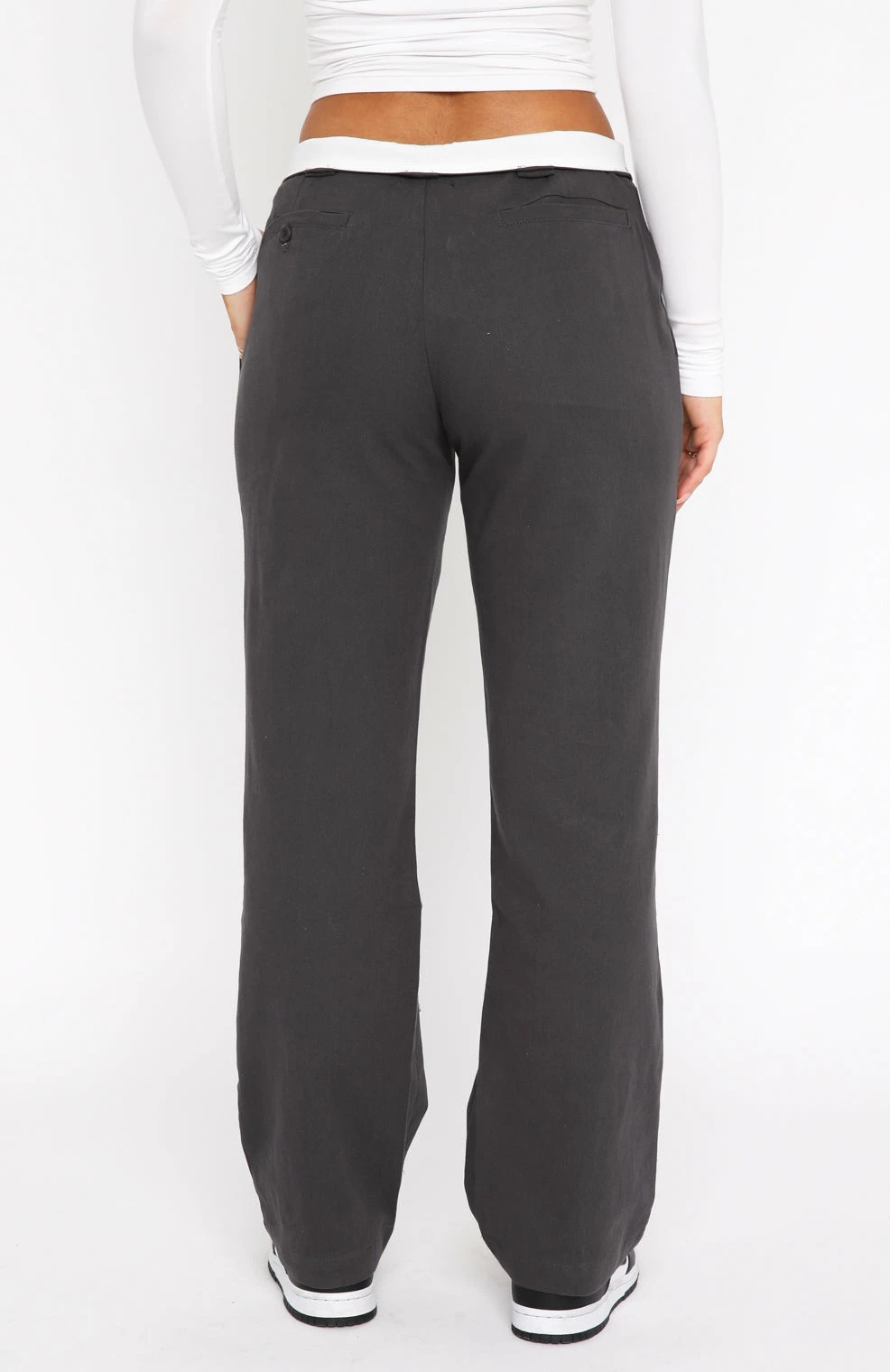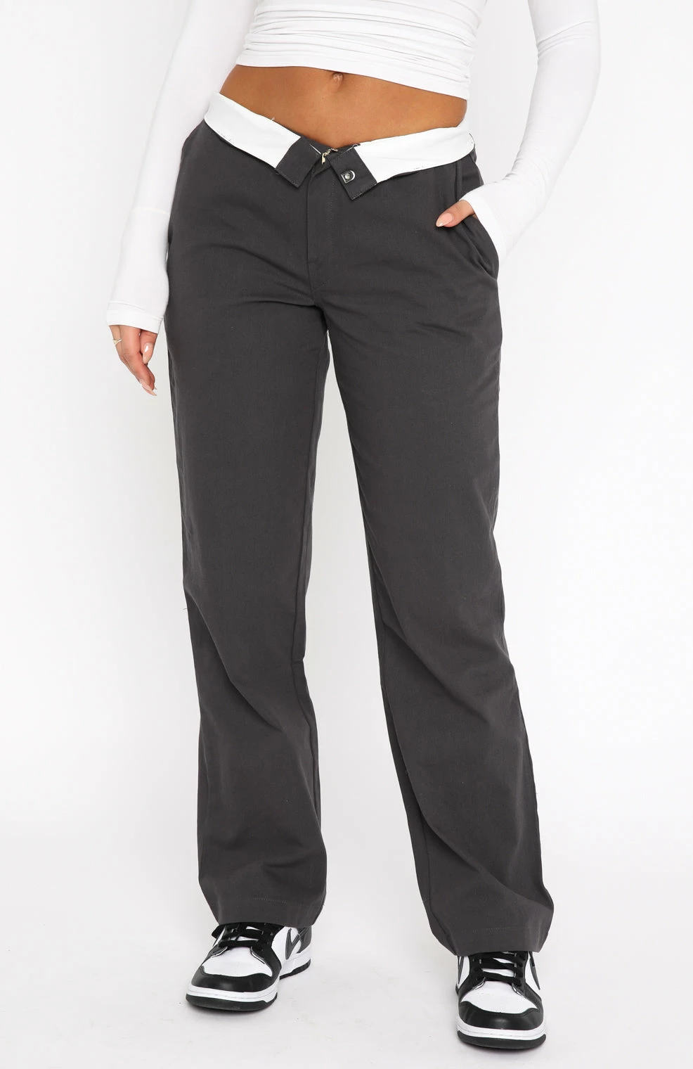 The Don’t Mess Around Pants in Charcoal are an essential in your everyday wardrobe. These pants are a straight leg fit with zip and clasp closure, pockets and 7 belt loops. You can wear with the waist turned over to show the white lining or closed. Complete the look with a cute crop and sneakers for the ultimate cool girl look.