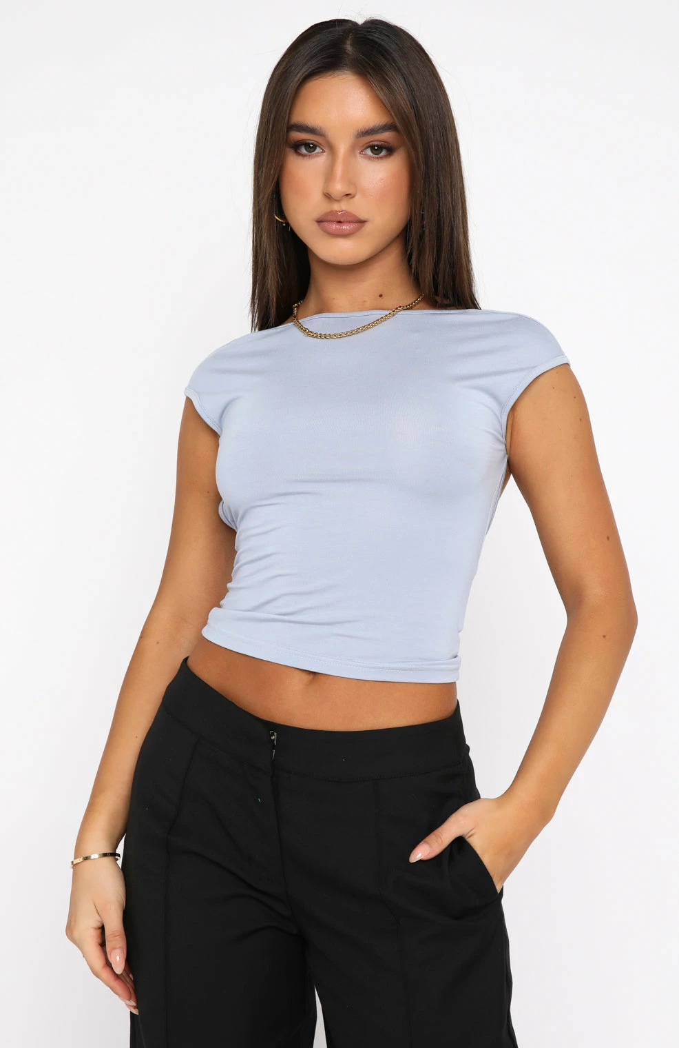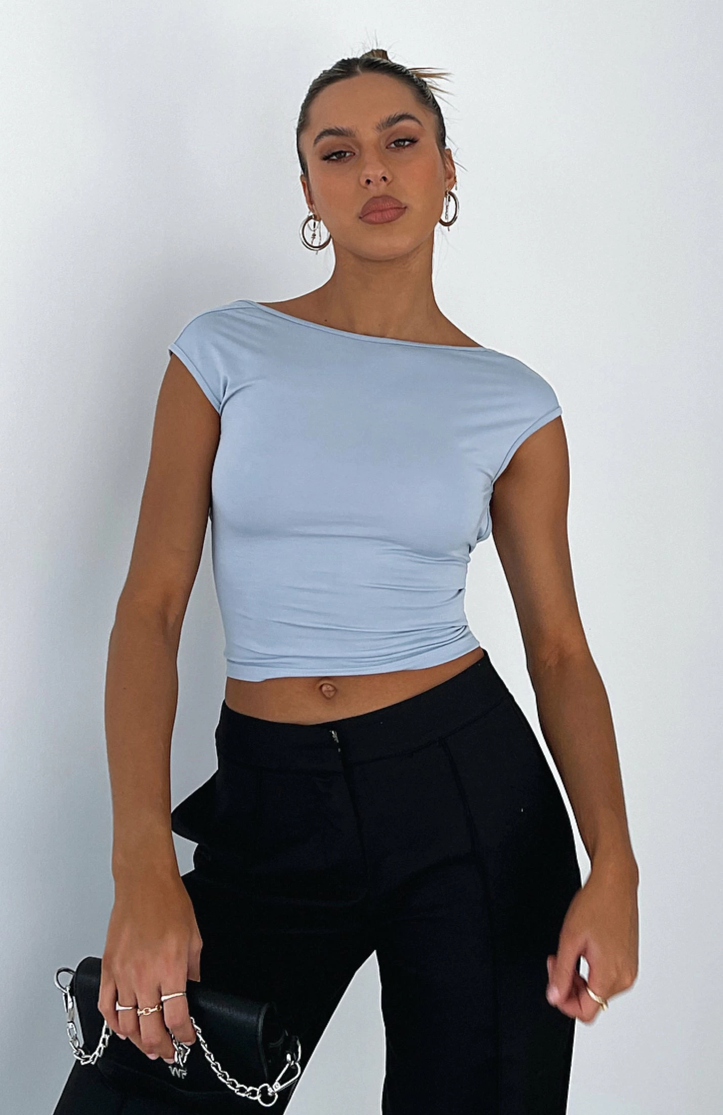 Obsessed is an understatement when it comes to the Double Life Tee in Blue. Featuring high neckline, short sleeves, cropped length, open back design and soft fabric. This top can be worn backwards for a plunge neckline. We love this top paired with cargo pants and gold accessories for a super chic look.
