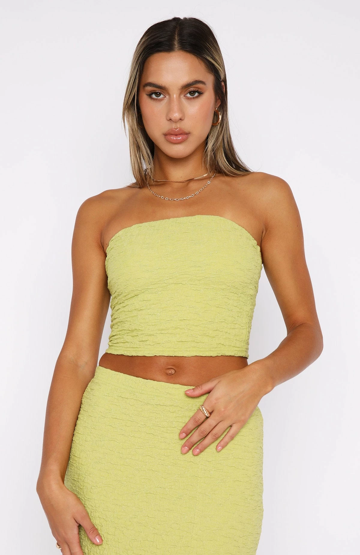 Pretty and perfect is how we would describe the Down To Business Crop Top in Matcha. This strapless crop features grip tape and lined, textured fabric. To complete the look pair with the Home Run Maxi Skirt and clear mules for a stunning look!