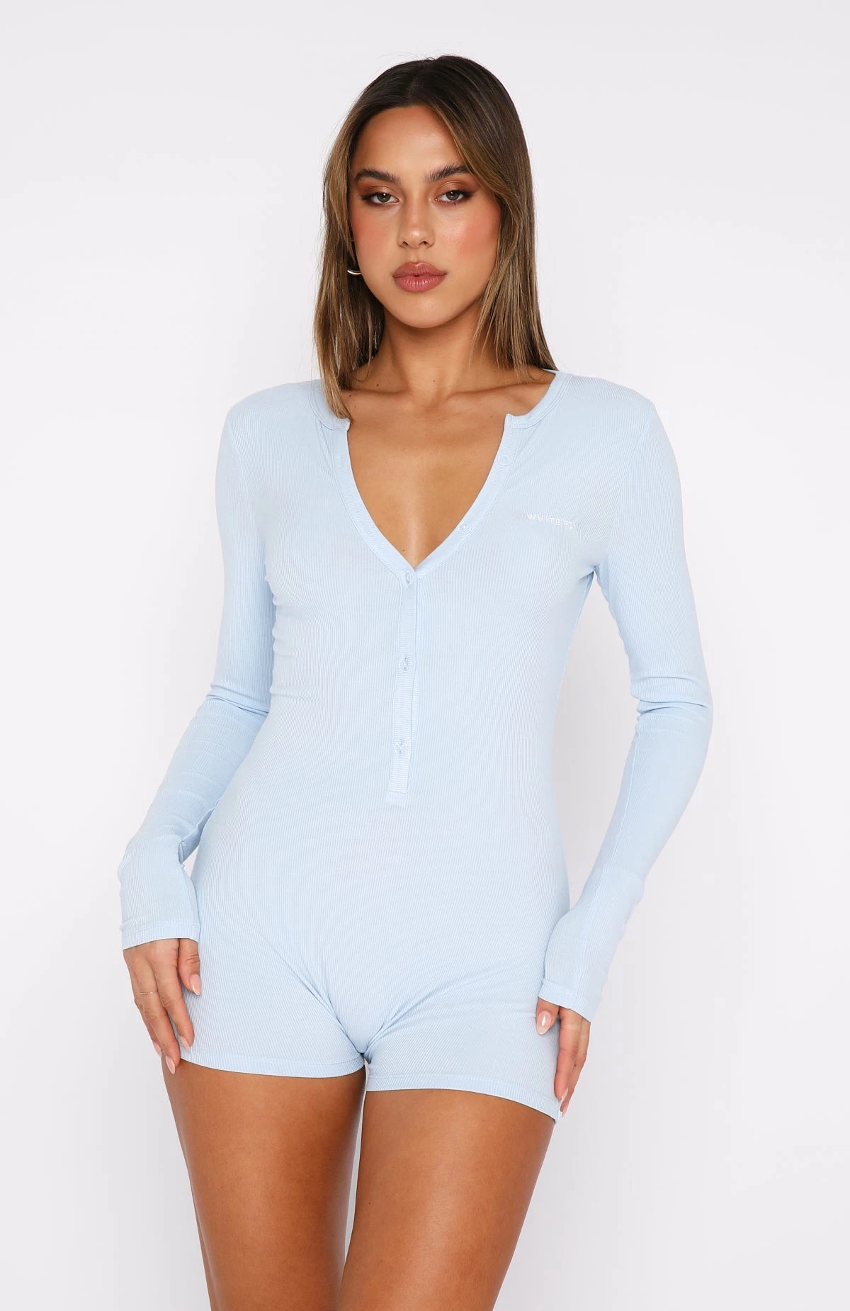 When you’re ready for chill time, the Dream With You Romper Baby Blue will be the easy outfit you need. Featuring long sleeves, button-up front closure, mini short length and self-lined stretch, side front logo and ribbed fabric. Pair with your go-to snugs and gold accessories for a chic and comfy look!