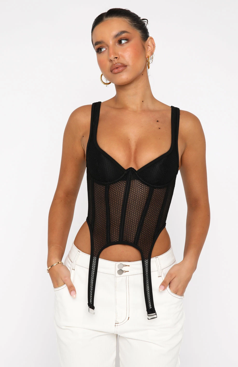 Look flirty and fun in the Enlighten Me Bustier in Black. Featuring boning in bodice, bust underwire, zipper centre back and double strap harness with silver trim. Complete the look with leather pants and heels for an unforgettable look.