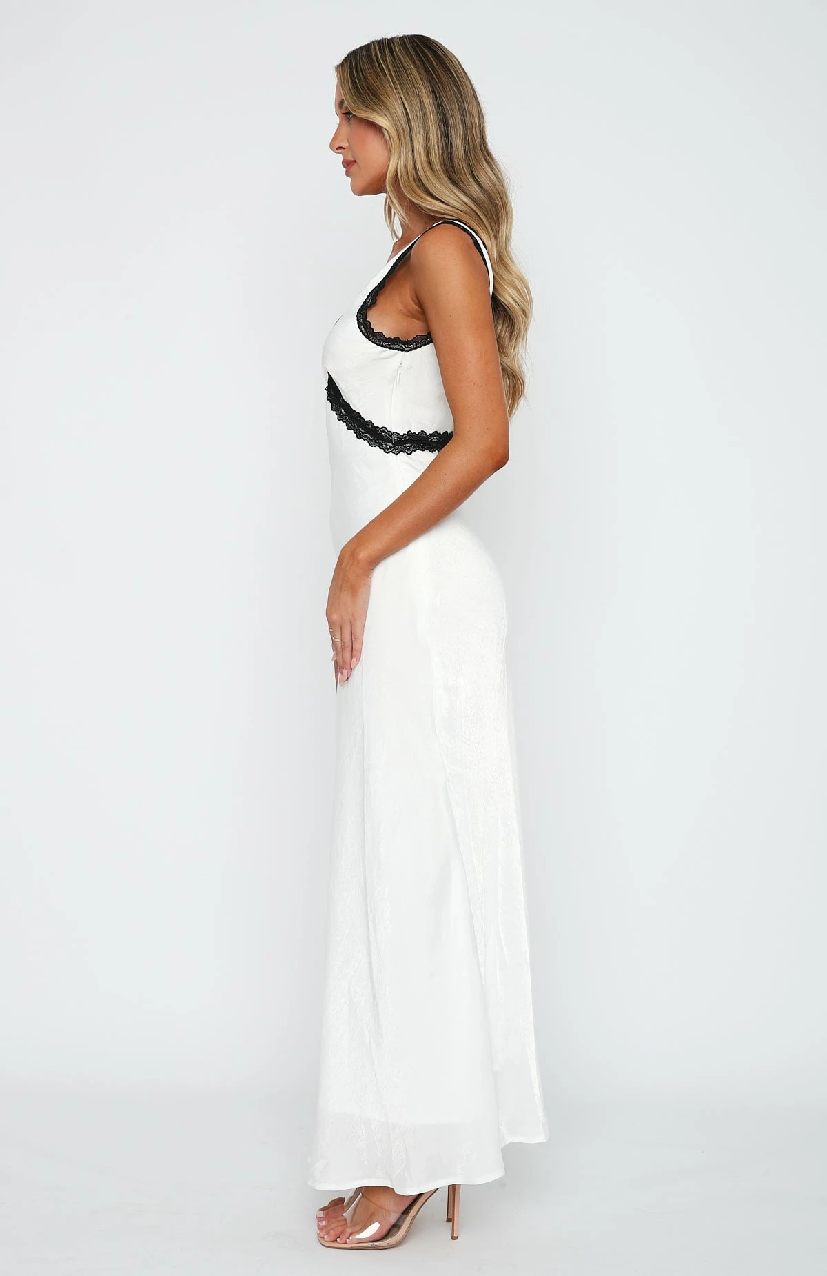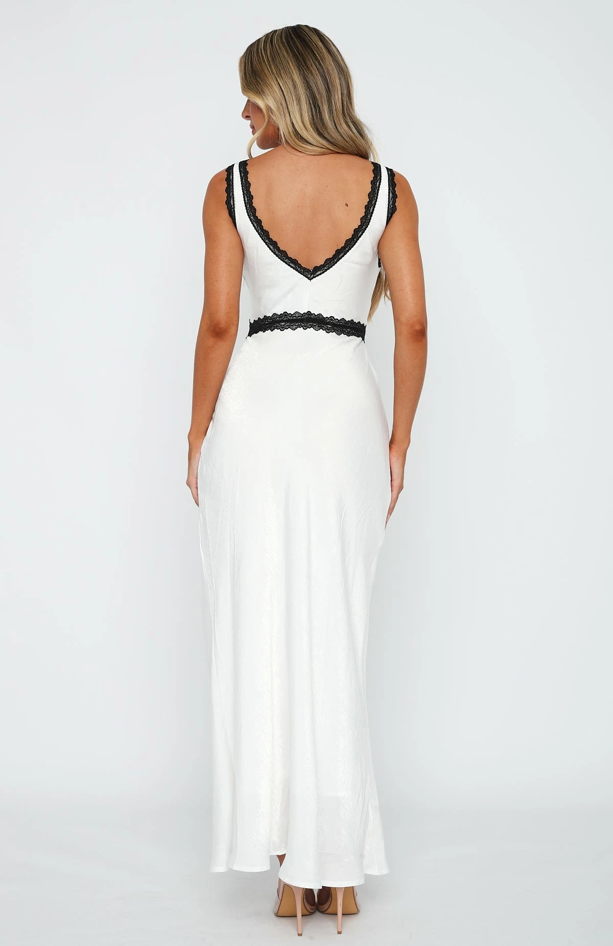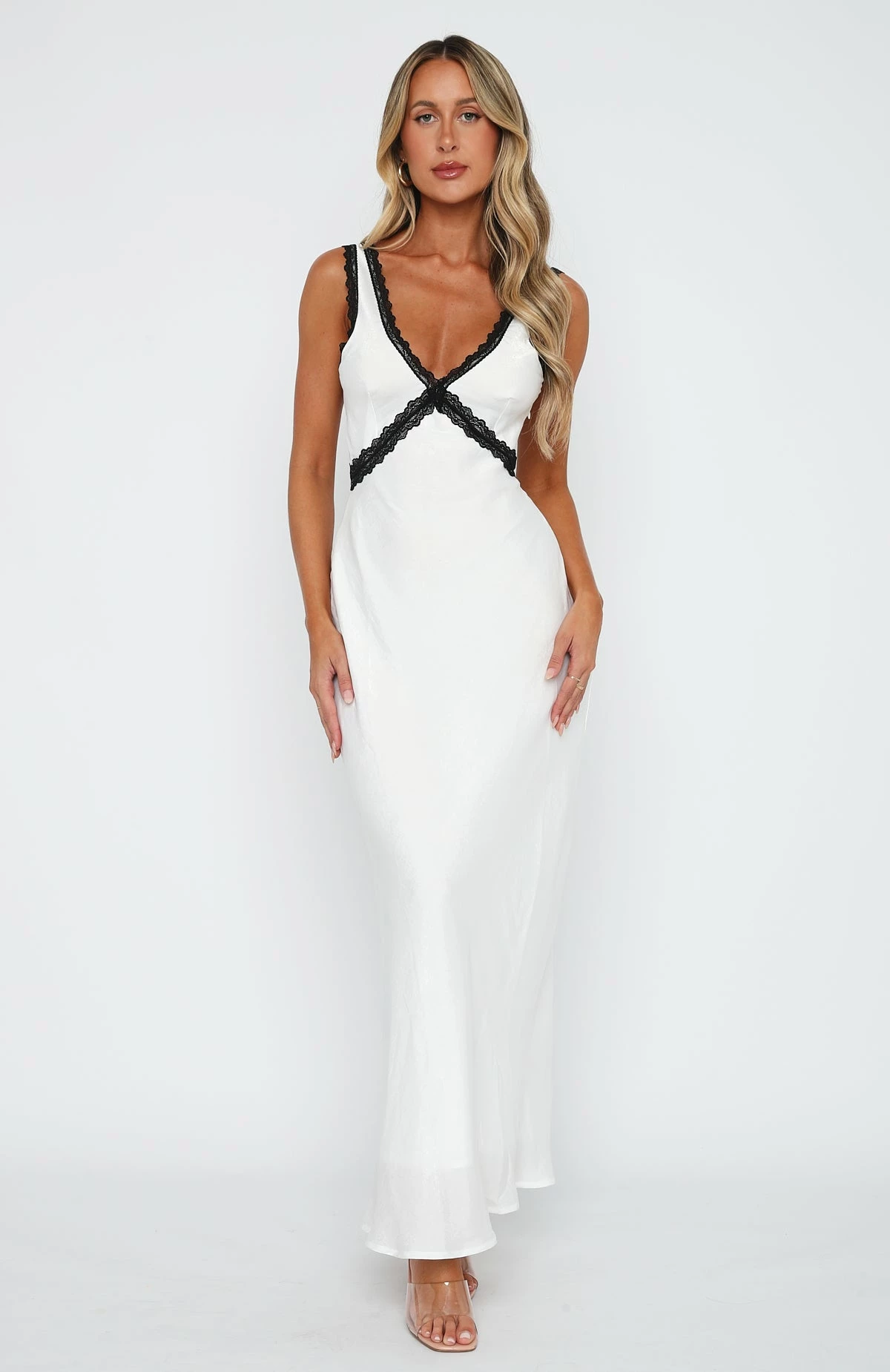 Live the lavish lifestyle in the Event Ready Maxi Dress in White. Featuring a plunge neckline, thick straps, invisible side zipper, open back design, lace detailing and satin fabric. Complete the look with gold accessories and perspex heels and let the dress do all the talking!