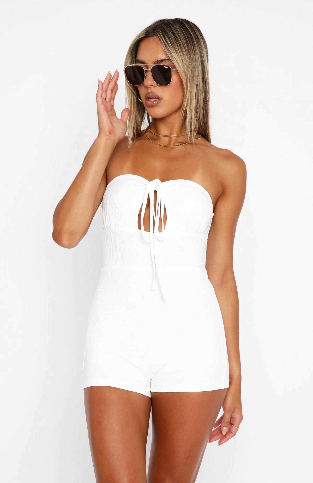 The Finer Things Playsuit in White is the answer to your styling dilemmas. This strapless playsuit features halter neck with tie design, grip tape, mini short length and lined, ribbed fabric. Complete the look with your favourite pair of summer slides and sunglasses for the perfect weekend fit!