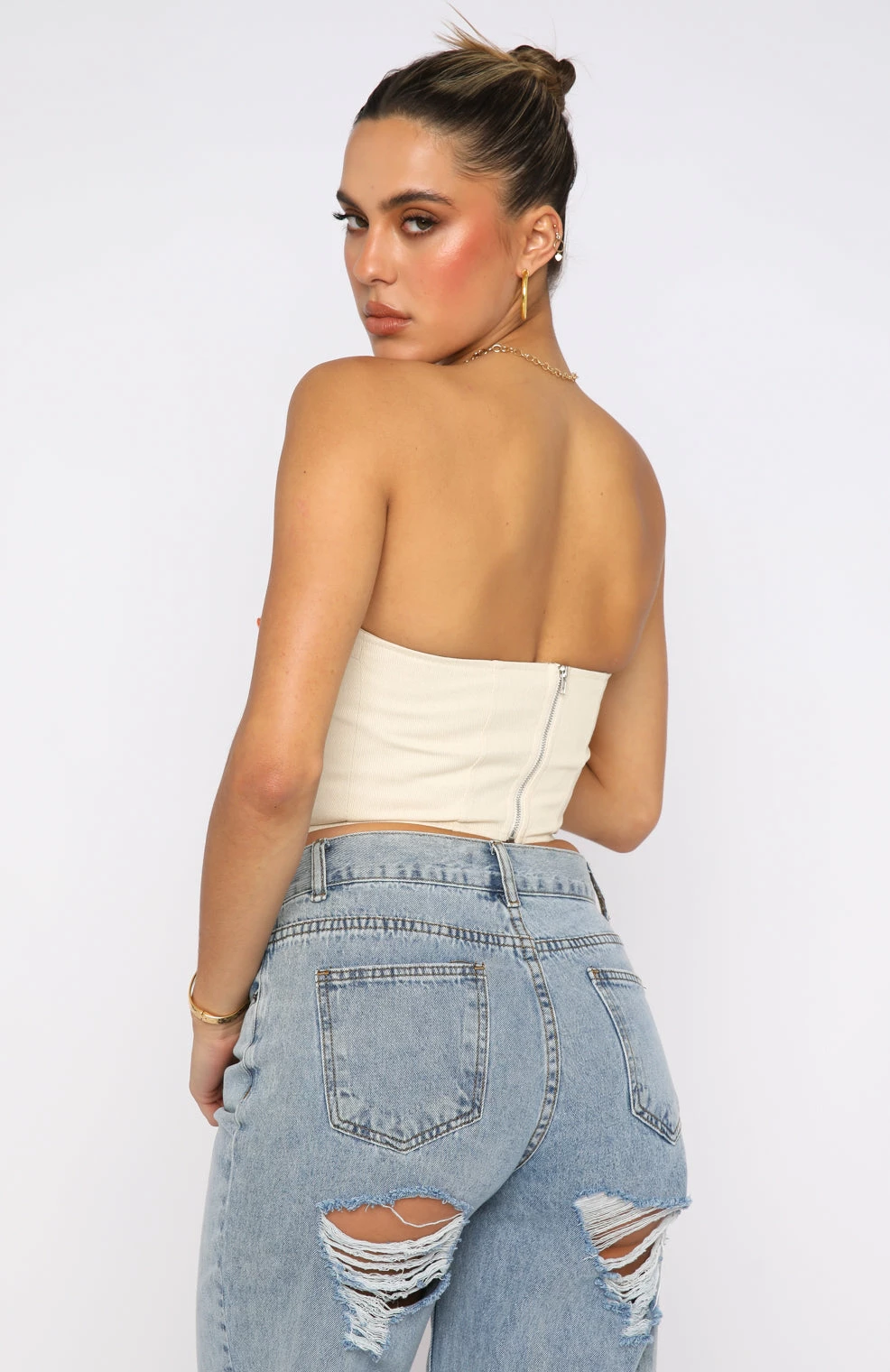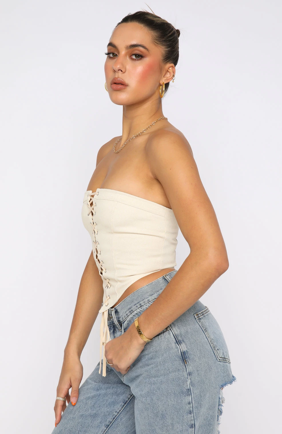 Get ready to turn some heads in the First Take Strapless Corset in Beige. This bustier is strapless and features lace up front detail, zipper centre back and lined to avoid sheerness. Pair with your favourite pair of White Fox Denim Jeans and gold accessories for a look White Fox Angels love!
