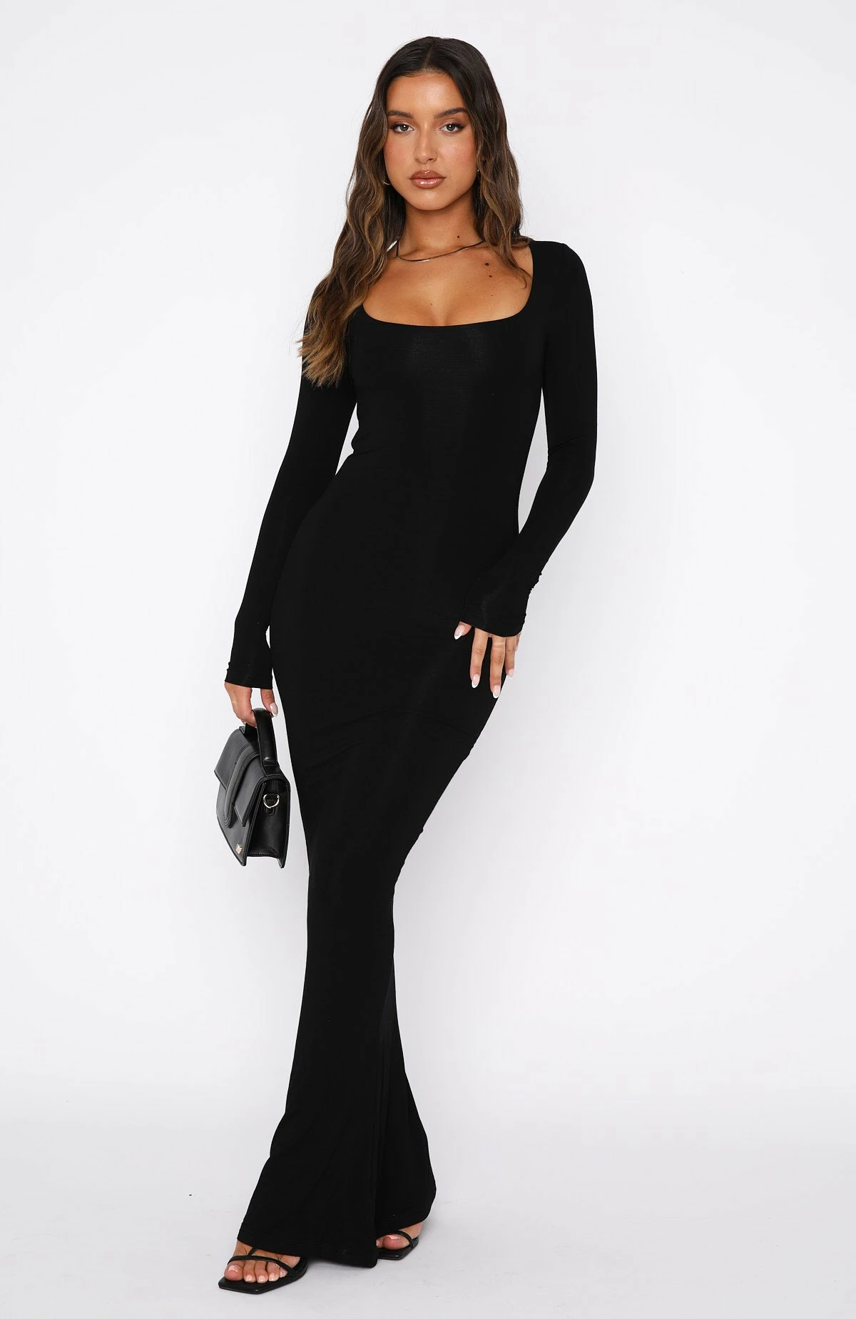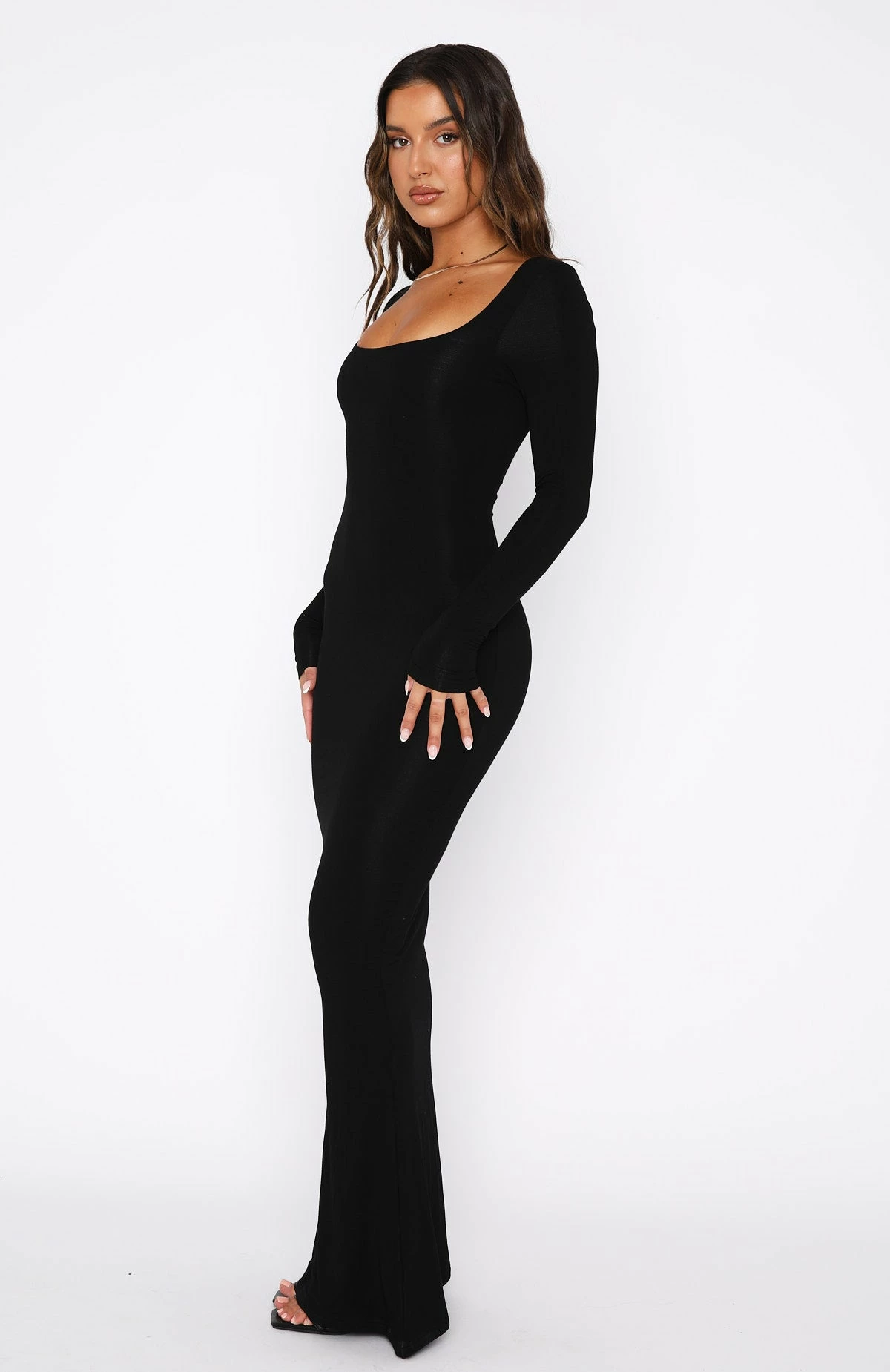 Elevate your date night wardrobe with the Get My Attention Long Sleeve Maxi Dress in Black. Featuring long sleeves, low scooped neckline and lined, thick stretch fabric. Pair with gold accessories and strappy heels for a glam look!
