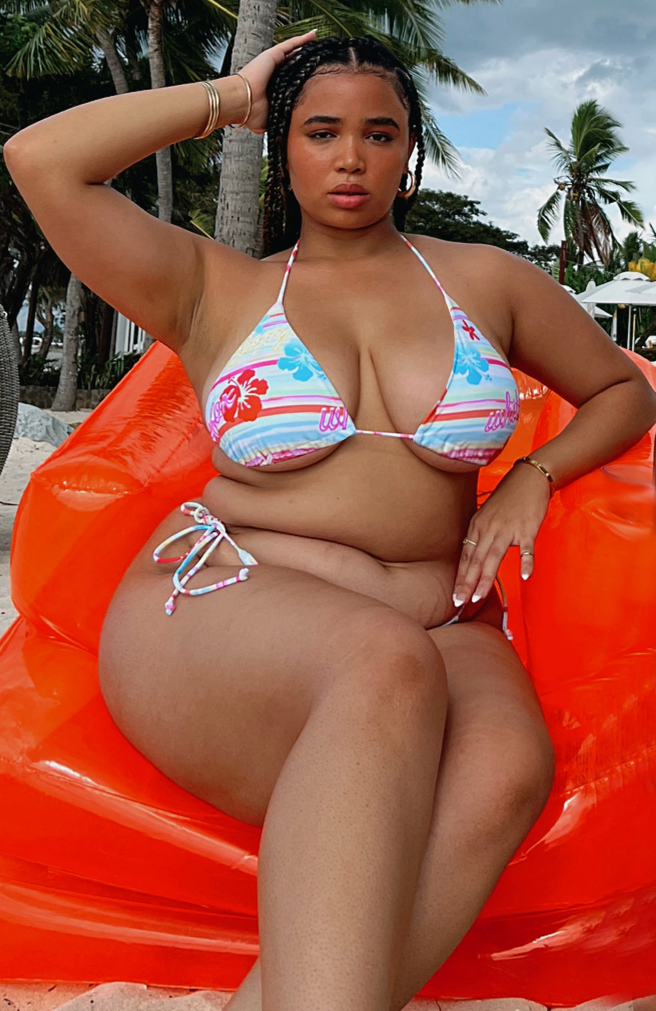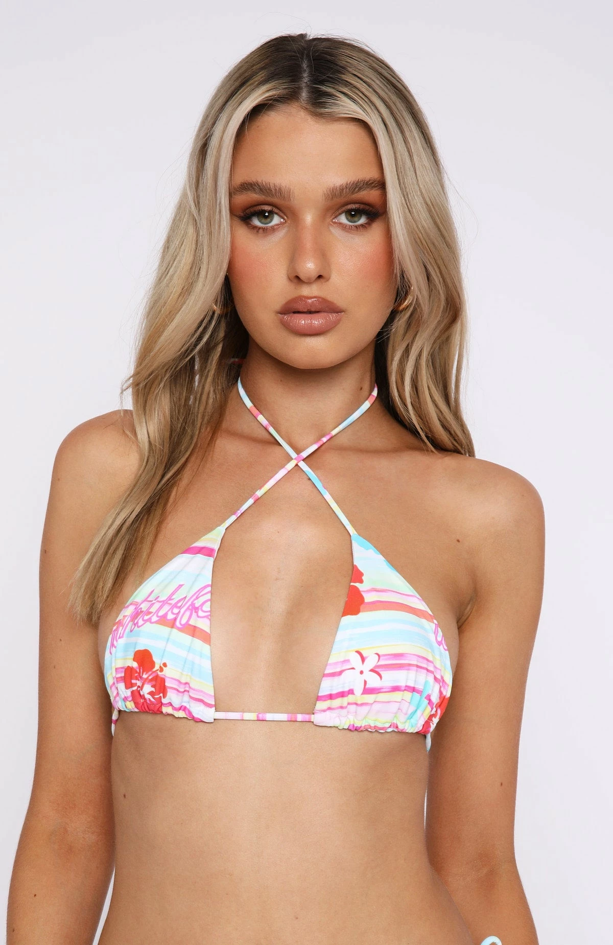 Look like a tropical goddess in the Golden Hour Bikini Top in Tropical Horizon. This triangle bikini top is a halter neck style with thin elasticated straps and removable padding. Pair with one of our matching Tropical Horizon Bikini Bottoms for the perfect poolside look.