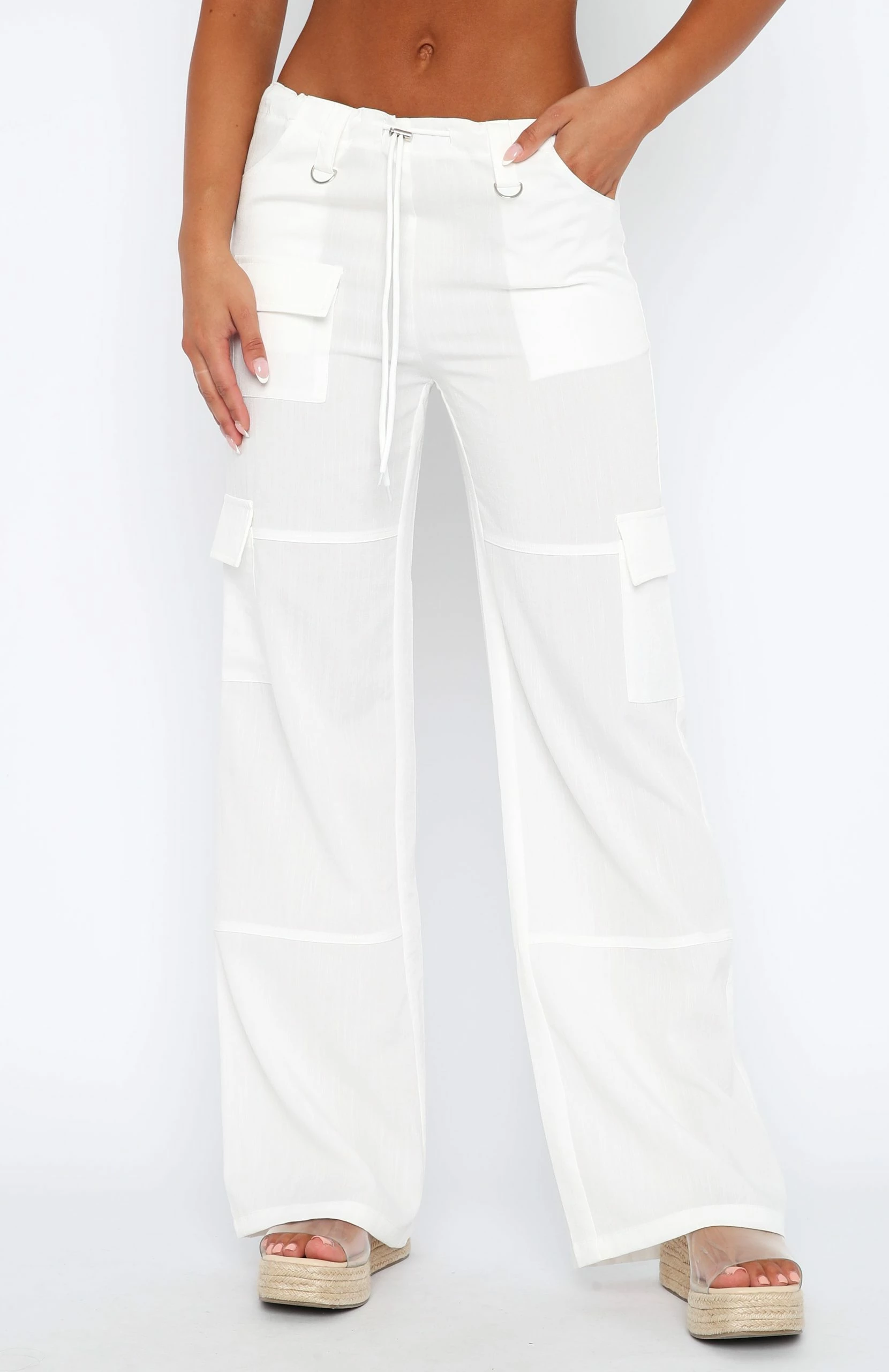 The Headsprung Pants in White are essential for a cool girl fit! These pants are low-rise and feature a cargo pants design, flared legs, drawstring with toggle and side pocket design on legs. Pair with a bustier and heels for a look we love!