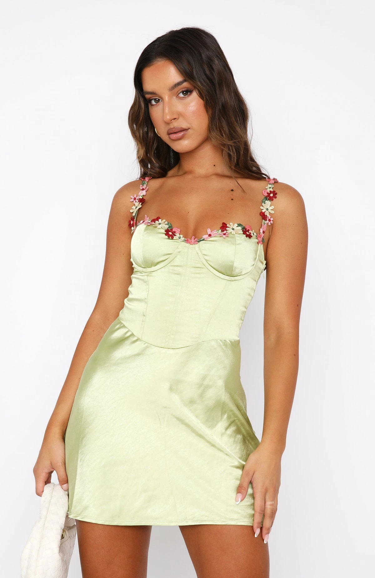 The Heart Of The City Mini Dress in Matcha is the dress of our dreams! Featuring thin, adjustable straps with floral detail, bust underwire, boning in bodice, invisible side zipper and self-lined, silk-feel fabric. Complete the look with clear heels and a cute mini bag for an unforgettable look!