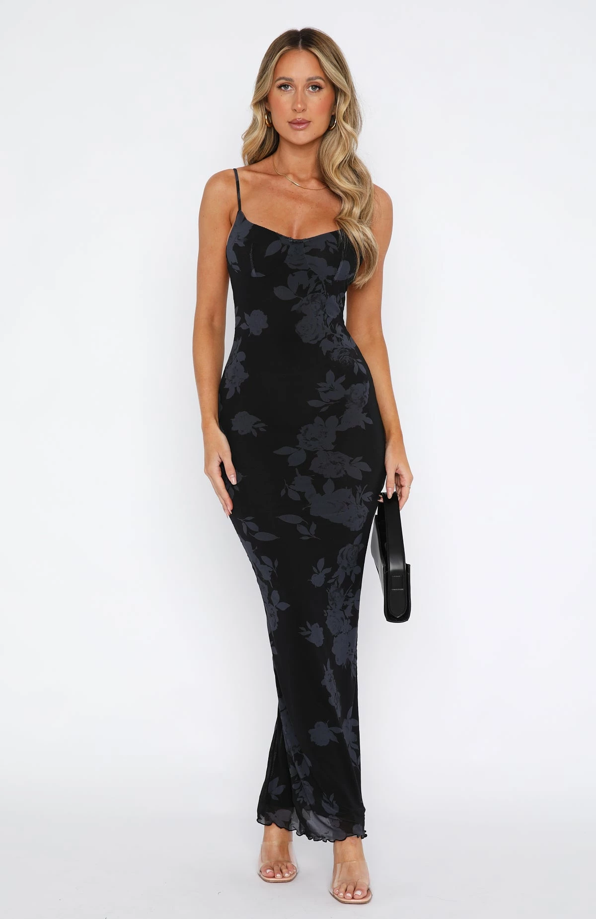 Look cute from head to toe in the I Don’t Miss You Midi Dress in Noir Rose. Featuring thin, adjustable straps, split back, low back design and lined, mesh fabric. Complete the look with clear mules and gold accessories for a look that we love!