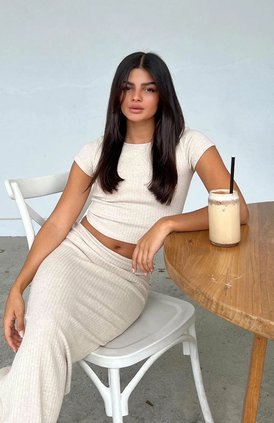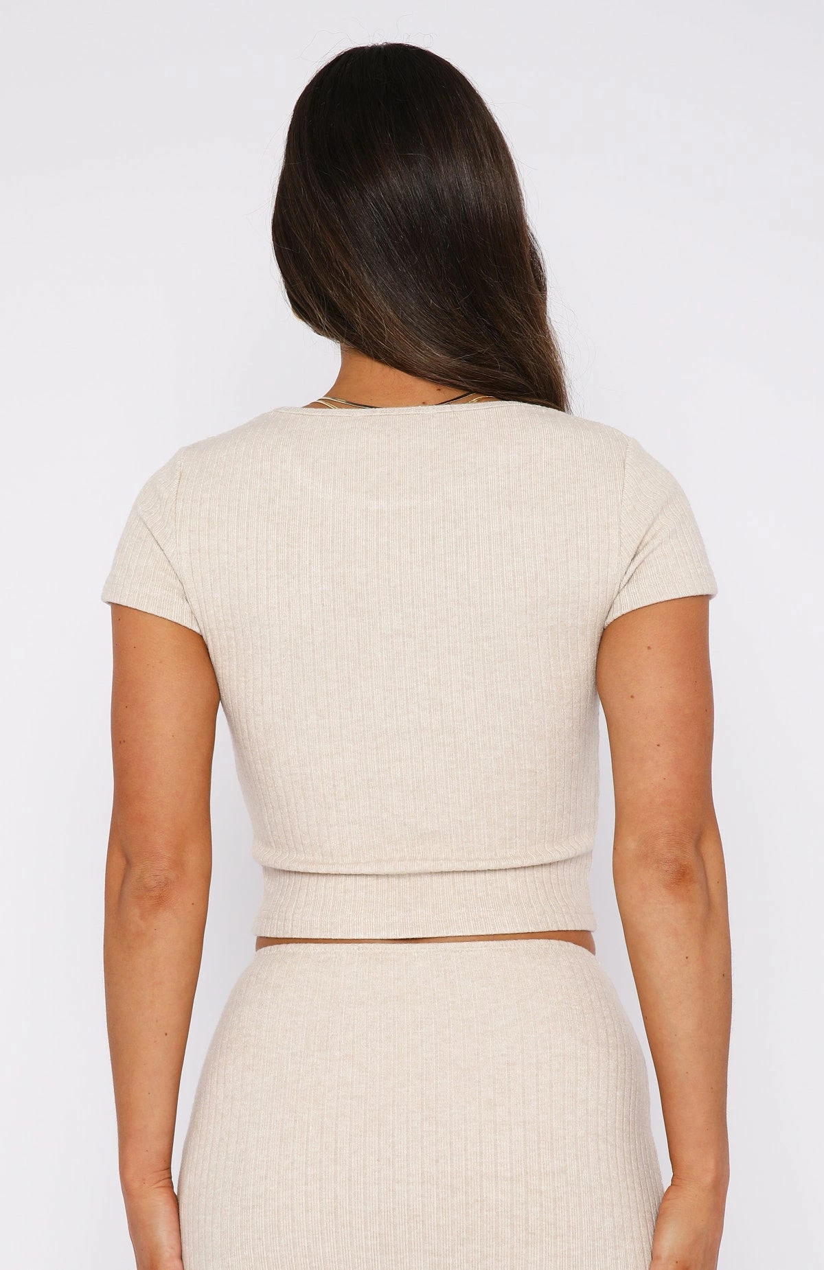 The In The Clear Ribbed Crop Tee in Oatmeal is the elevated basic your wardrobe is waiting for. Featuring a high scooped neckline, short sleeves, cropped length and soft, ribbed stretch fabric. Style with either Night Life Pants, Time For Me Shorts or Flirtatious Midi Skirt for a super cute set!