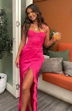Our very own White Fox angels birthday dress the Just Can’t Get Enough Maxi Dress in Lipstick. Featuring thin, adjustable straps, bust underwire, boning in bodice, front leg split with frill design, invisible zipper centre back and self-lined silk feel fabric. Complete the look with gold accessories and perspex heels for a gorgeous look!