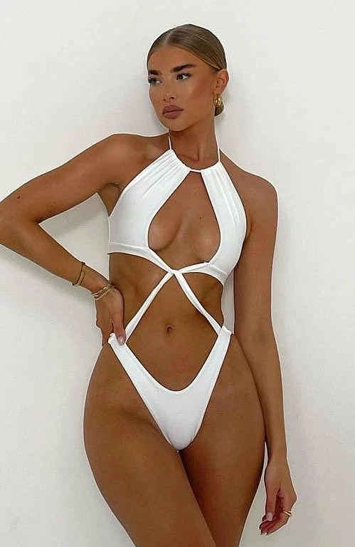 The Kauai One Piece in White screams confidence. This one piece features a high neckline with halter neck tie, cut out chest detail, criss cross design, open back and cheeky cut design. We love this piece worn as swimwear or styled as a bodysuit.