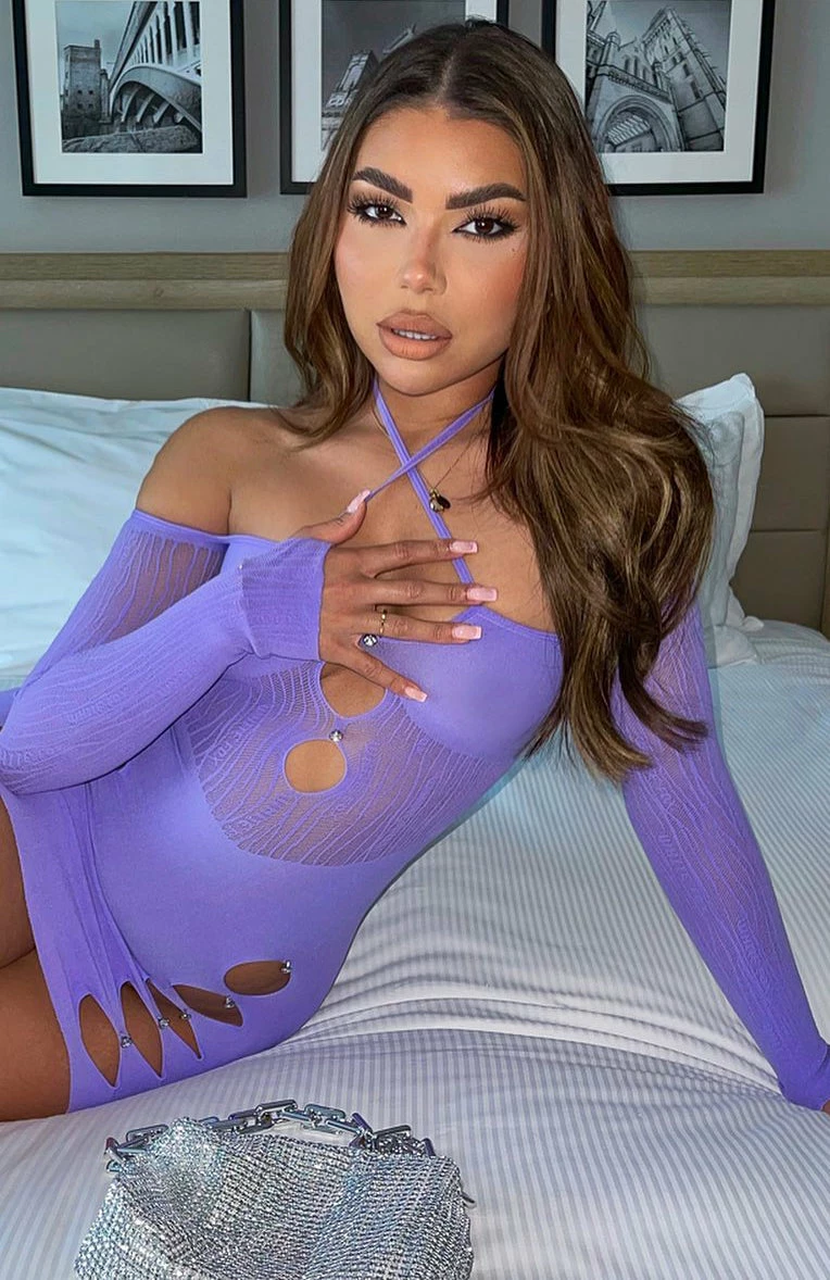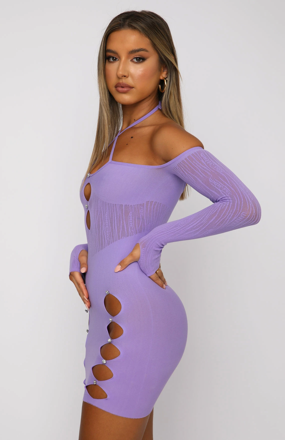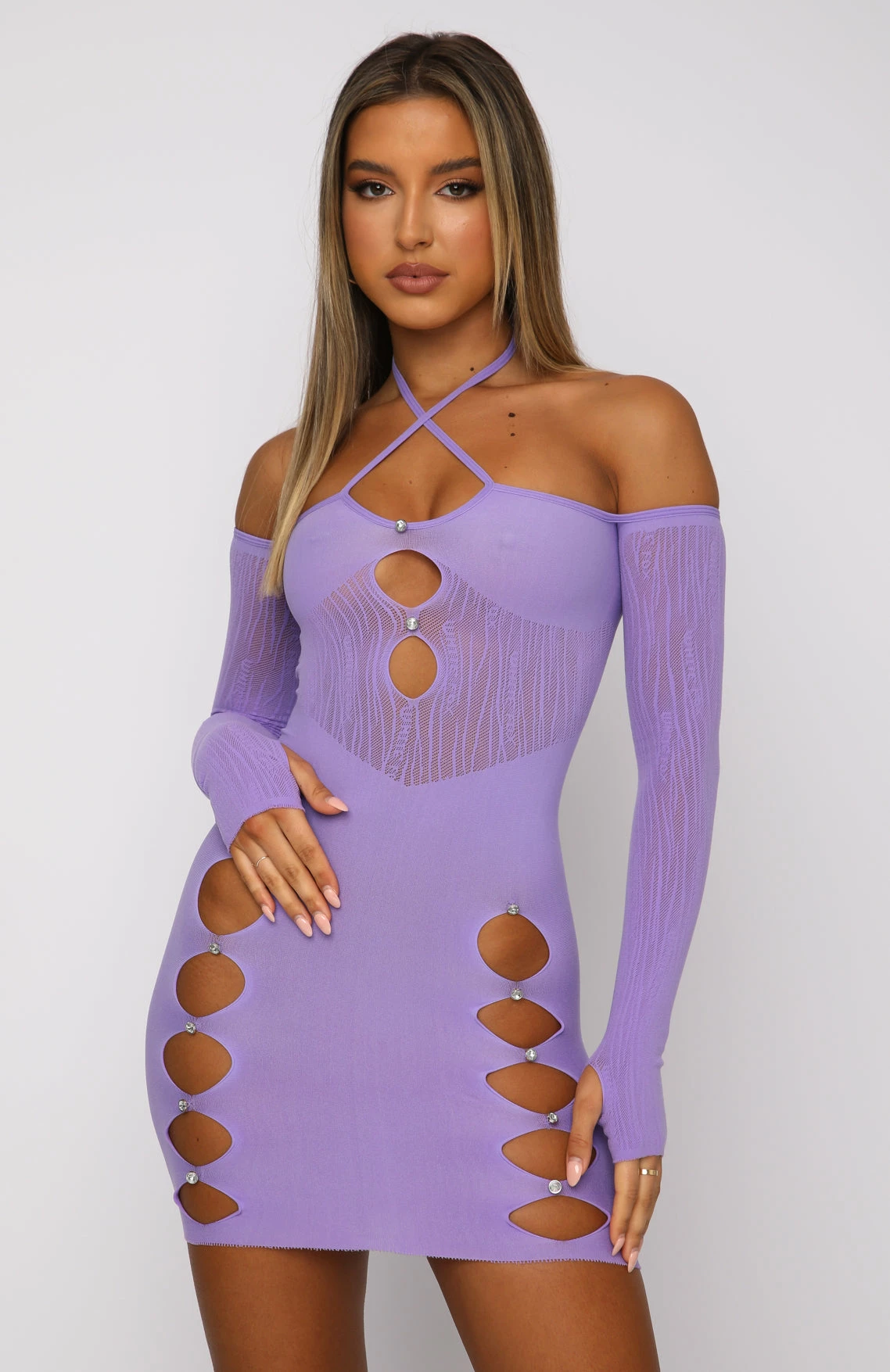 The dress of our dreams exists in the Keep On Looking Mini Dress in Purple. This stocking mini dress features mini length, long off the shoulder sleeves, cross over halter neck tie, cut out details on sides and chest with diamanté detail. This is a delicate sheer fabric with stretch so one size fits most. Pair with perspex heels or fresh kicks to dance the night away.