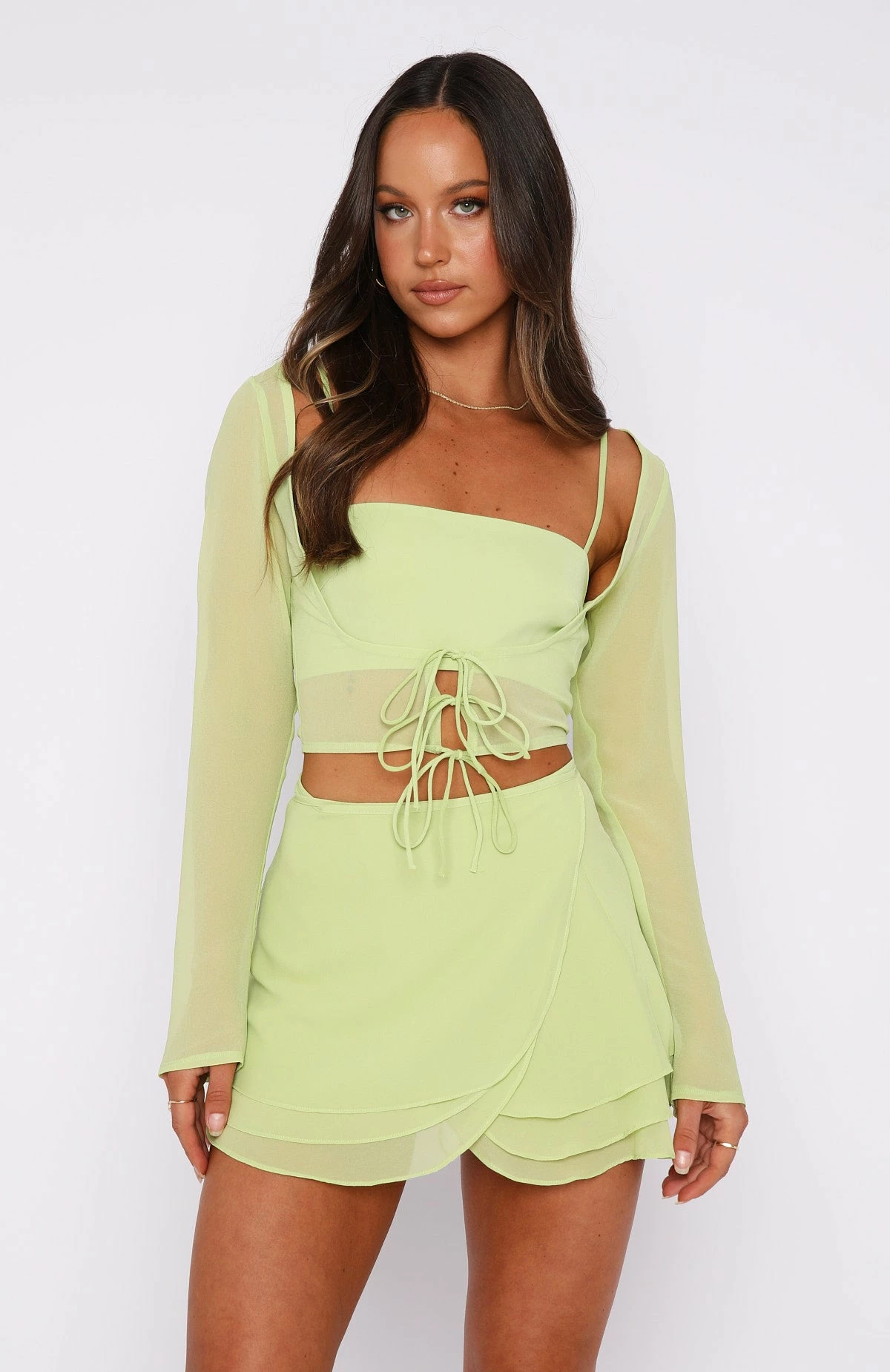 The Keep You Close Mini Skirt in Matcha gives us ALL the vibes! This mini skirt is high-waisted and features lined, lightweight fabric and wrap design. We love this paired with the matching Tied To You Long Sleeve and clear mules for a stunning look!