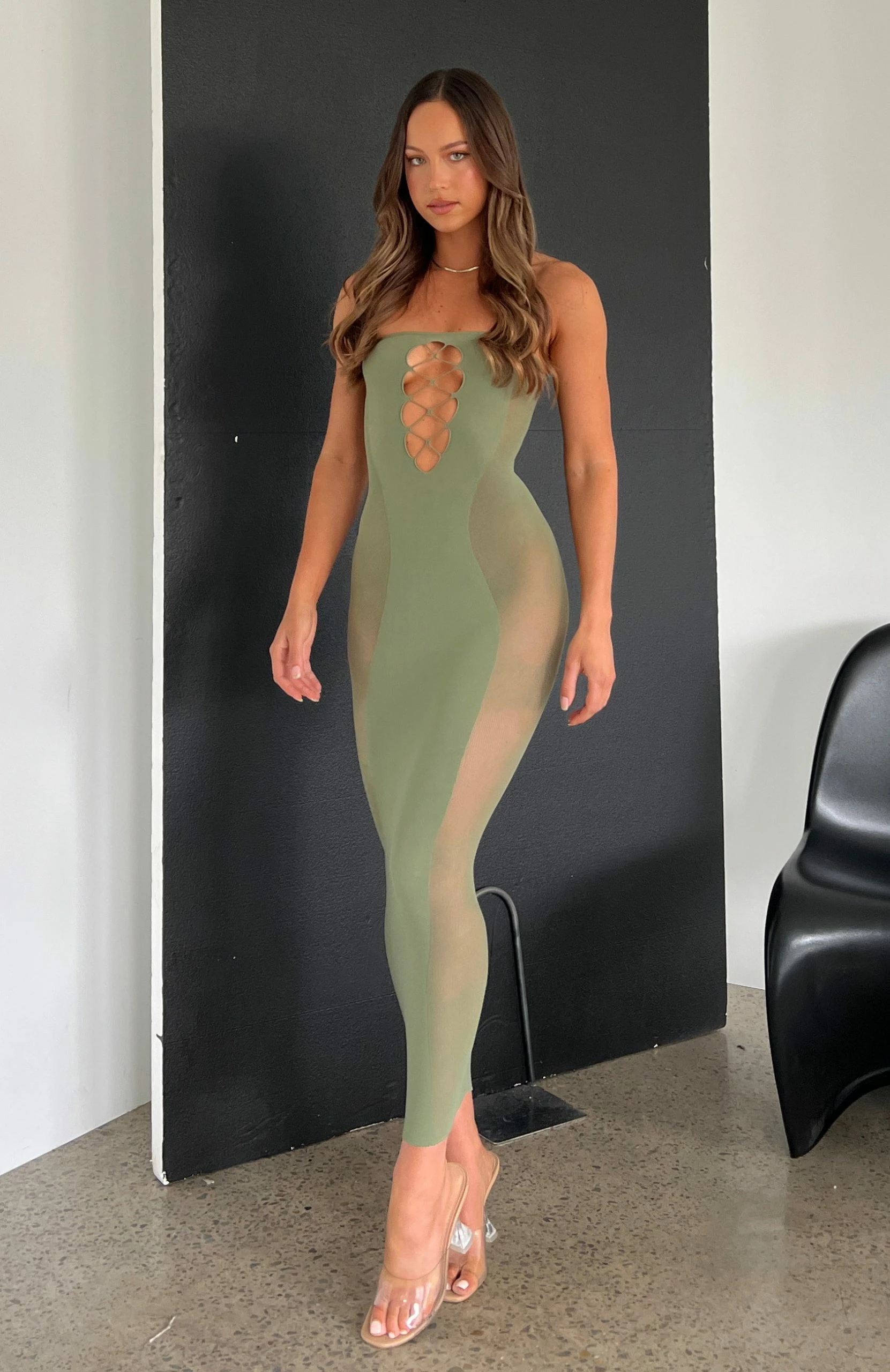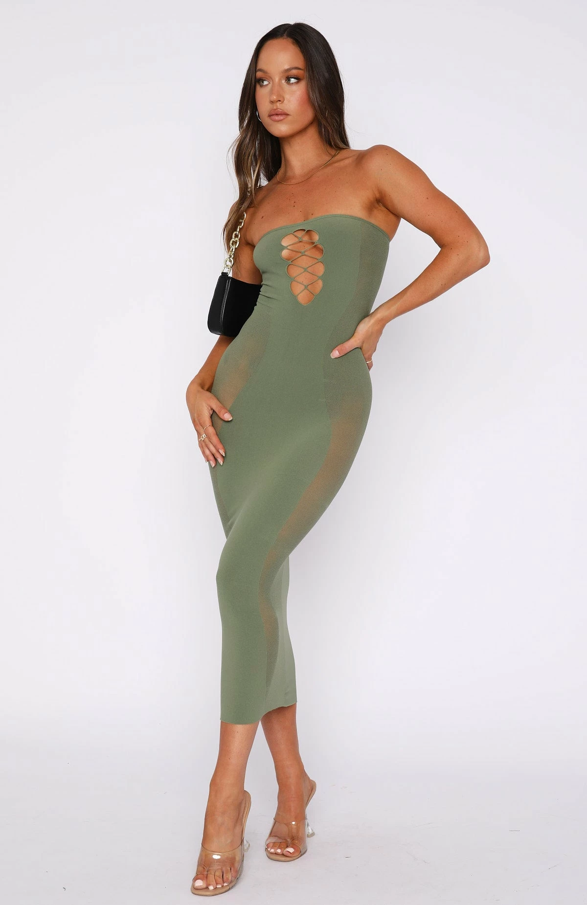 Spice up your night out look with the Kiss And Tell Midi Dress in Khaki. This stocking midi dress features cut-out bust/midriff design, open back design and midi length. This is a delicate sheer fabric with stretch so one size fits most. To complete the look pair with simple accessories and clear mules and let the dress do all the talking!