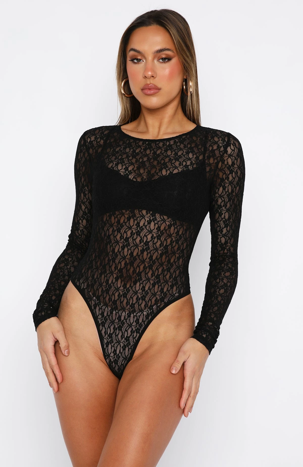 Found some last-minute weekend plans and need an unreal ‘fit? Then we have you covered with this styling staple. The Later Than Usual Bodysuit Black features a long sleeve design, hook and eye closure, centre back hidden zipper, high neck fit and sheer, lace fabric. Keep the look effortless with a low rise jean and perspex heels!