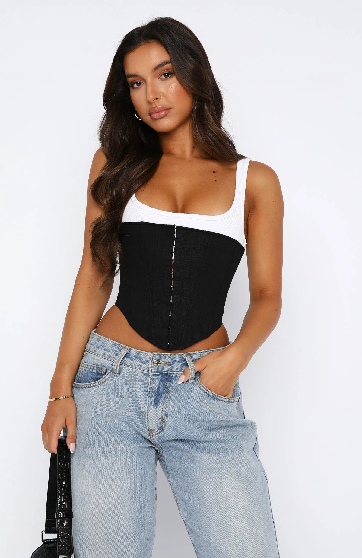 Introducing the Lay It Down Bustier Black, made to give you all the cool girl vibes you’ve been after. Featuring thick straps, boning in bodice, lace-up centre back design, front hook & eye closure, contrast ribbed fabric and unlined fabric. Slip into this bustier and pair it with you favourite White Fox jeans and slides for a casual day out.