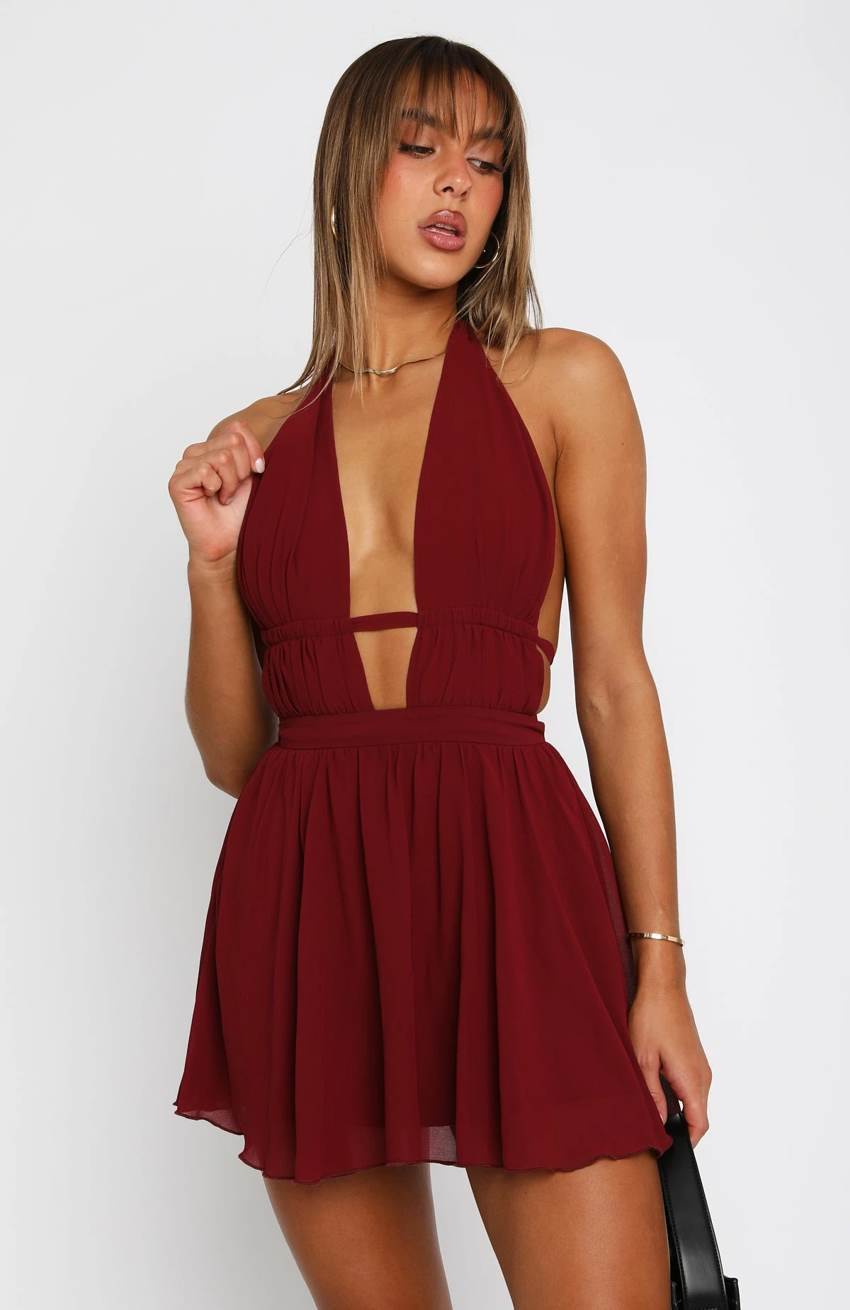 The Let You Know Mini Dress in Wine is the dress of our dreams! Featuring plunge neckline, halter neck style with tie design, frill hem and lined, chiffon fabric. Complete the look with gold accessories and perspex heels for a dreamy look!