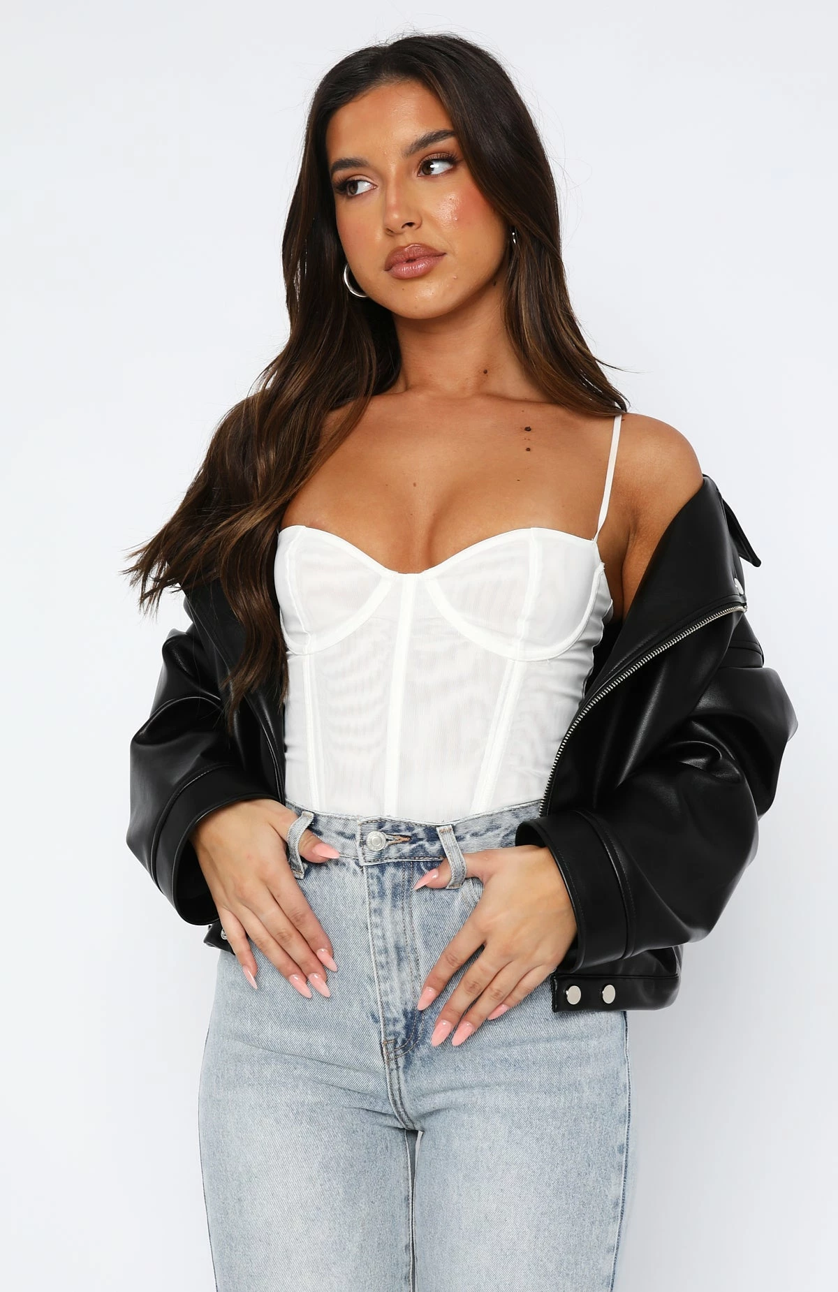 Spice up your night out look with the Like I Love You Bodysuit in White. Featuring thin, adjustable straps, bust underwire, invisible zipper centre back, boning in bodice, mesh fabric and popper closure. Complete the look by wearing it under the Look Back At It Midi Dress or with your favourite pair of White Fox Denim Jeans. The options are endless!