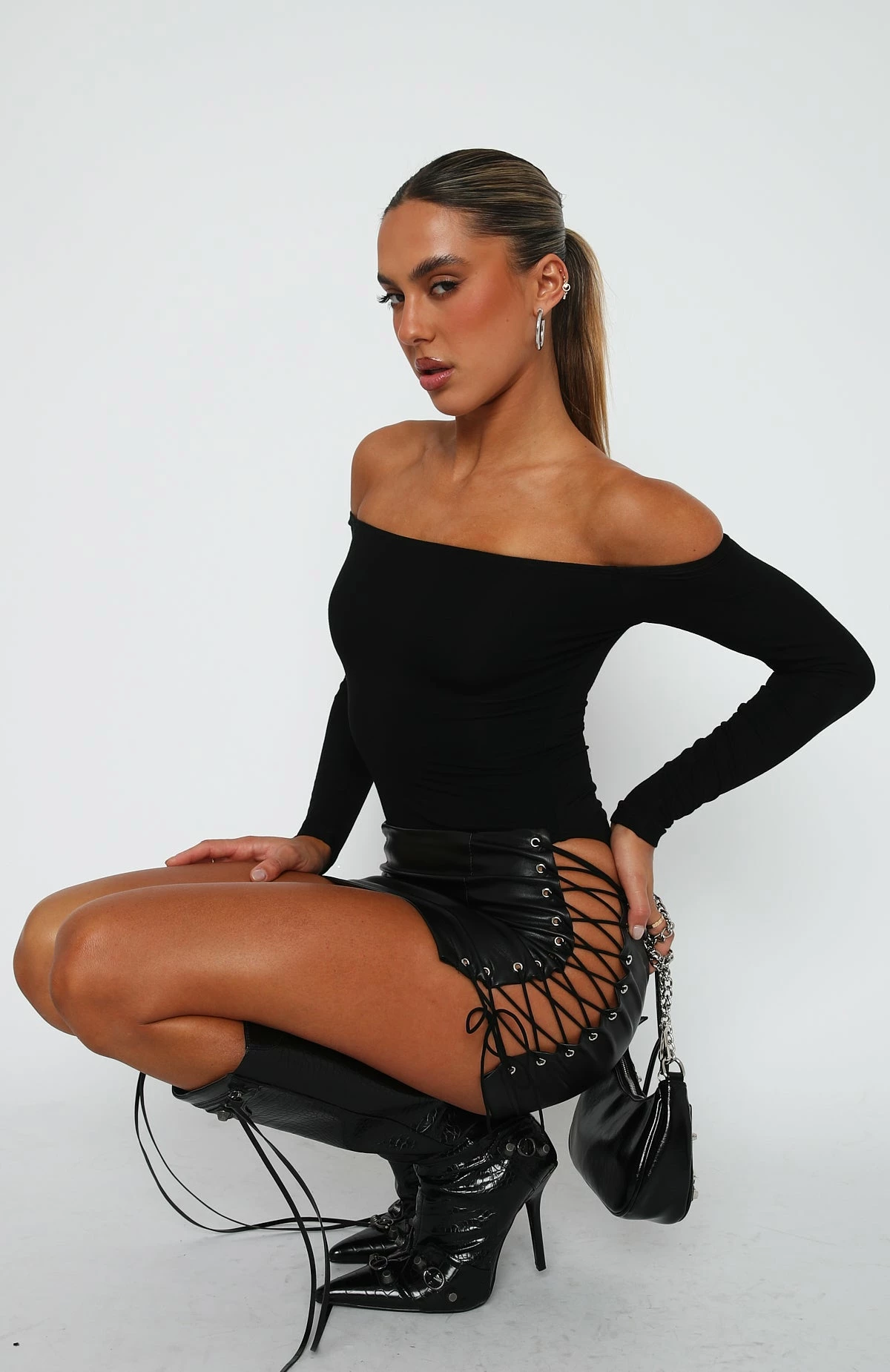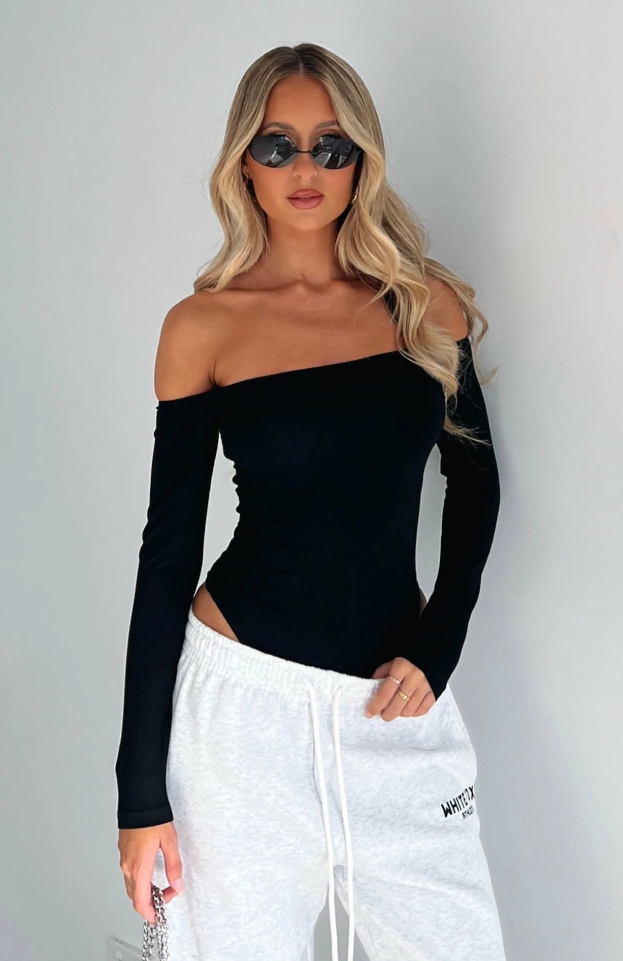 Featuring off-the-shoulder design, long sleeves, cheeky cut design, snap closure at crotch, mesh lining and stretch fabric. Complete the look with a mini skirt and knee high boots for a look we love!