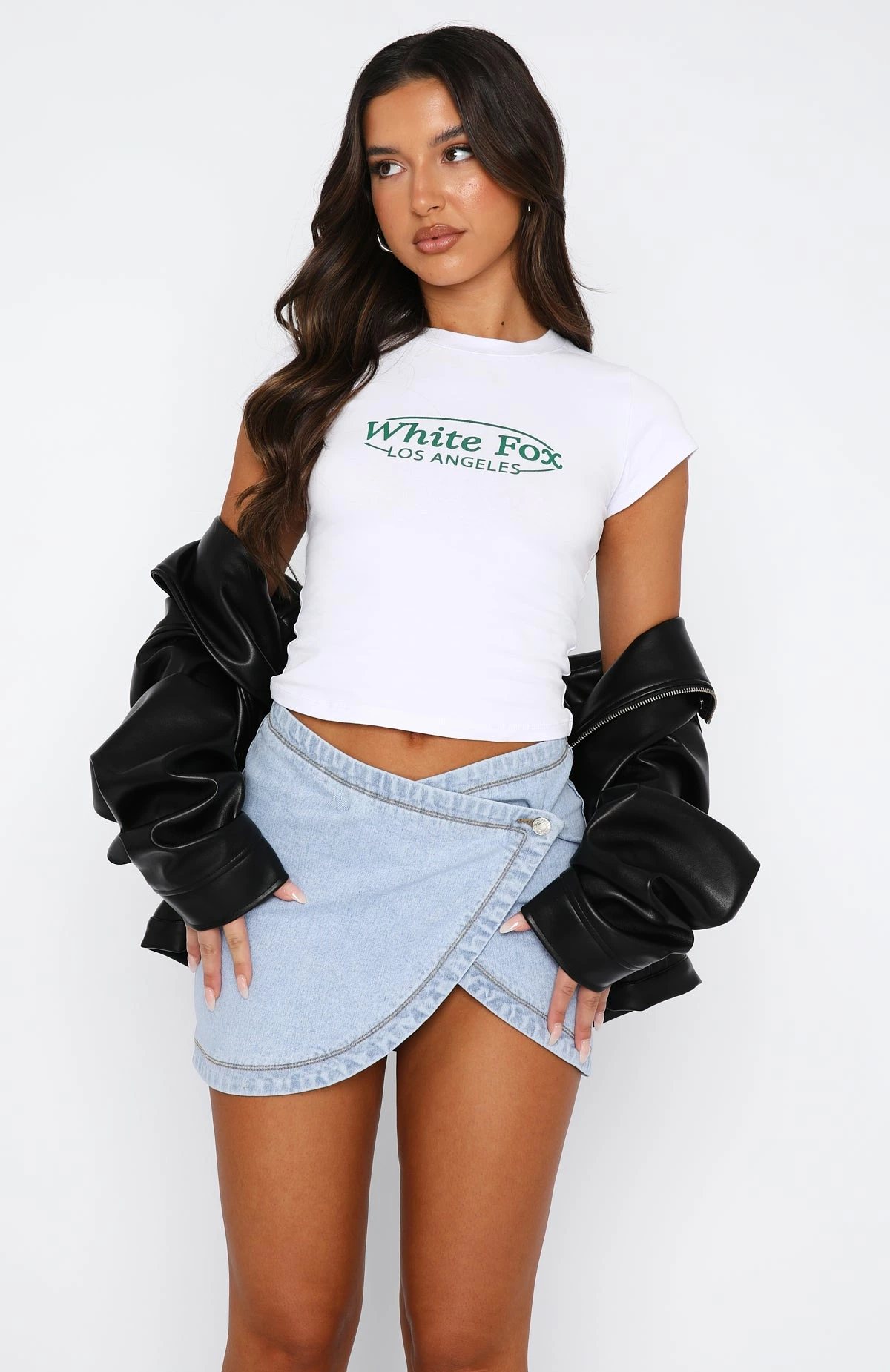 Give your off-duty look some attitude with this Lost in A Dream Denim Mini Skirt Light Blue Wash. This mini skirt is a mid-rise fit and features a two button closure, asymmetric design. Pair with a cute crop and slides for an effortlessly chic look!