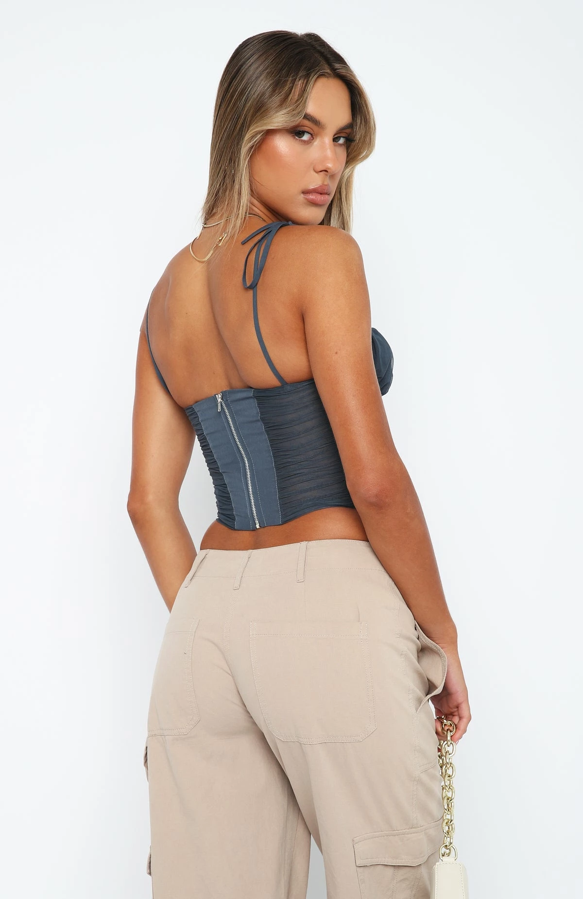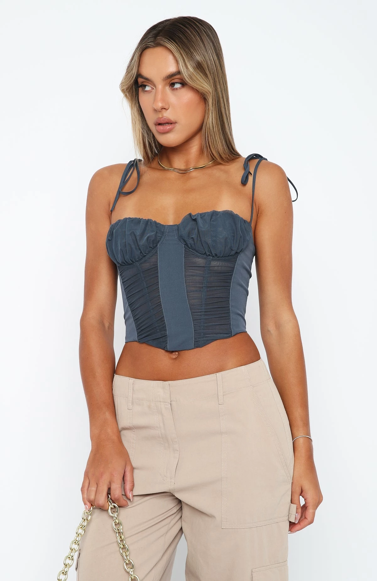 Add some structure to your look with the Make The Move Bustier in Charcoal. Featuring thin, adjustable straps, bust underwire, boning in bodice, zipper centre back and lined mesh fabric. We love this paired with PU pants and perspex heels for a look we love!