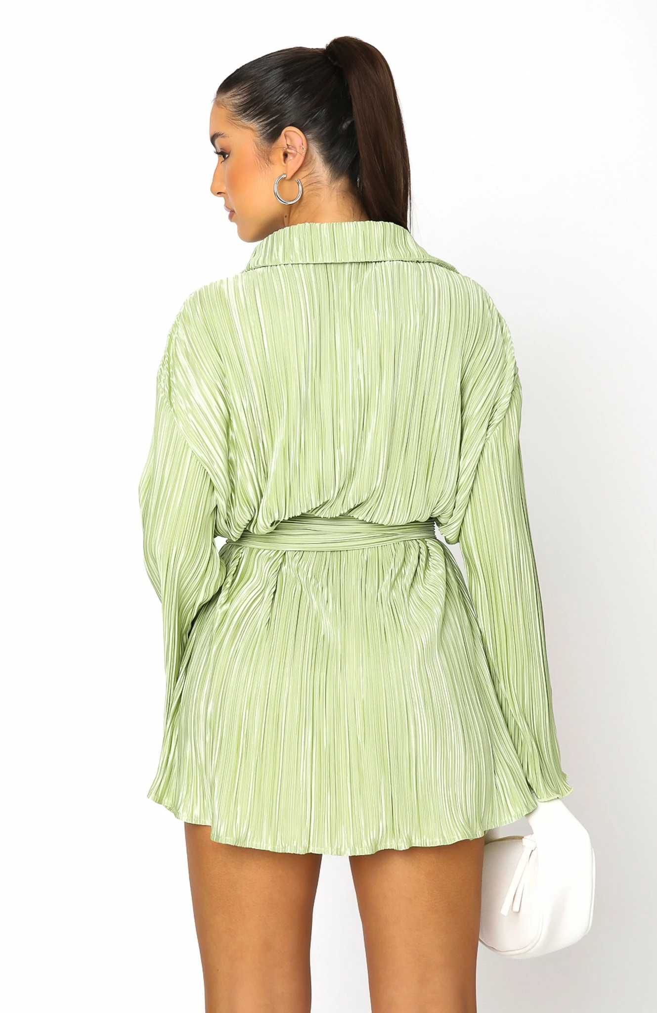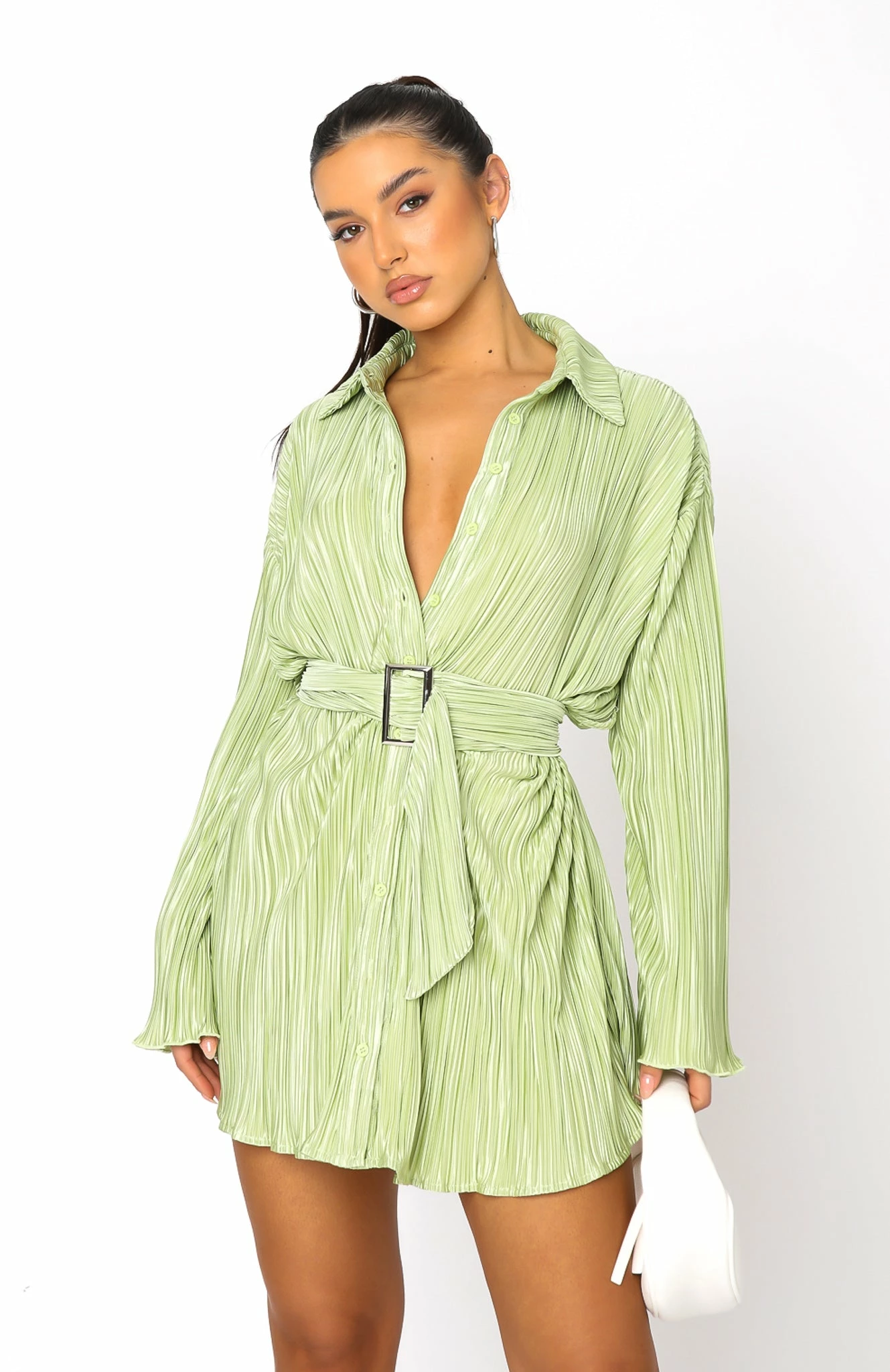 The More About Me Mini Dress in Pistachio is the dress you’ve been waiting for. Featuring long sleeves, collared neckline, button closure, detachable belt with silver buckle detail, and plisse finish fabric. We love this paired with knee high boots and a cute mini bag for a chic look.