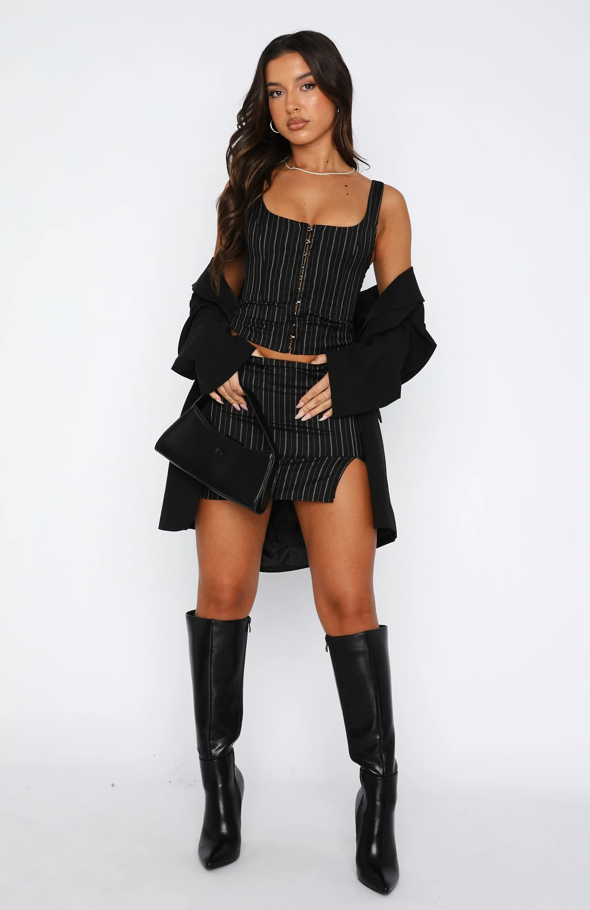 The outfit of our dreams is here! The Move On Over Mini Skirt in Black Pinstripe is high waisted with a side leg split, invisible zipper centre back, and lined fabric. We love this paired with the matching What They Want Crop and knee-high boots for a dreamy combo!