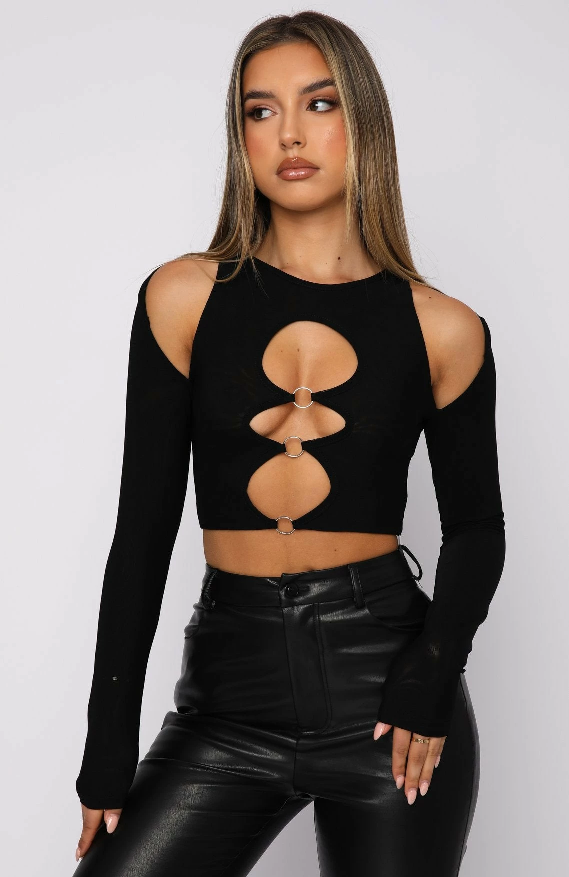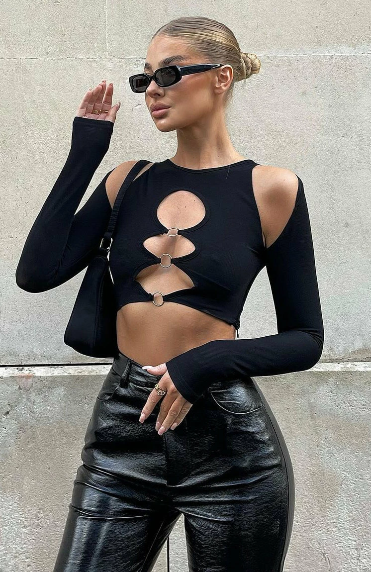 Say hi to our new My Only Vice Crop in Black, a staple basic with a sexy twist! Featuring long sleeves, high neckline, cut out design with ring detail, cut out shoulder design, invisible side zipper and mesh fabric. Pair with faux leather bottoms and heels for an insta-worthy look.