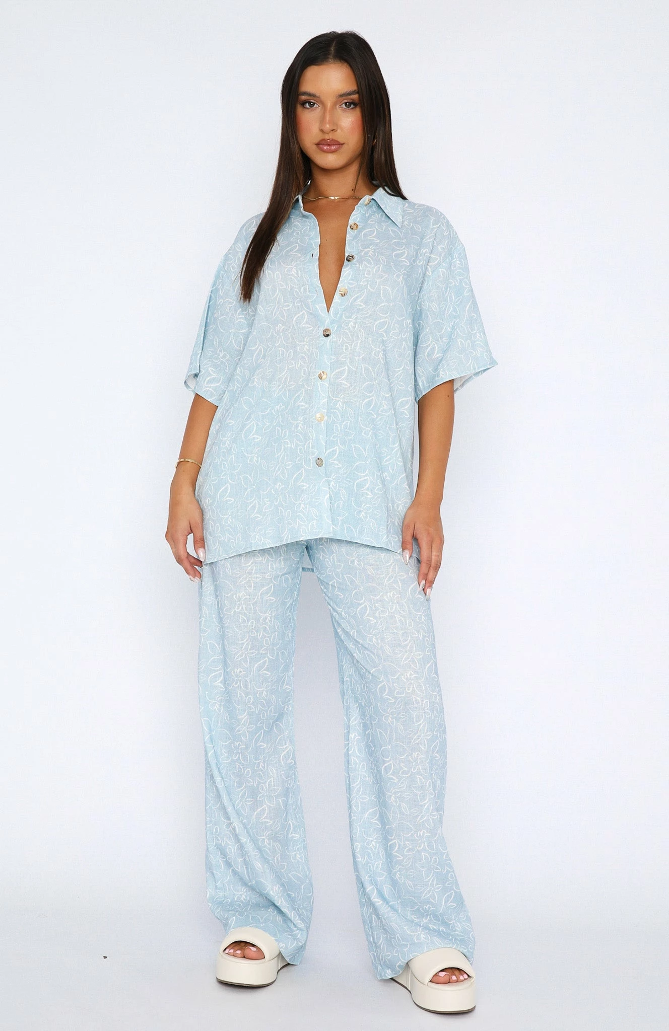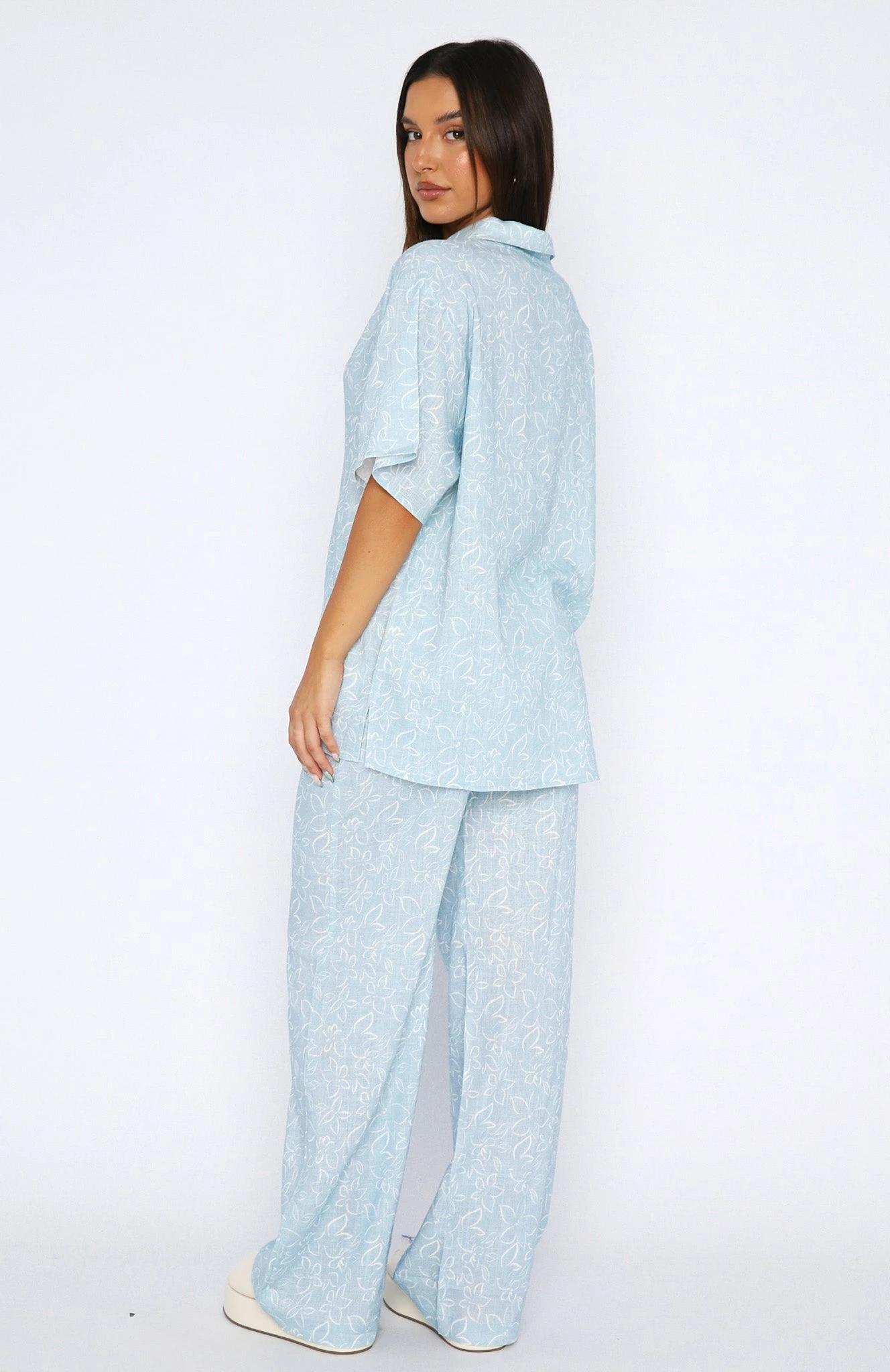 Add a fun print to your wardrobe with the Need A Recap Pants in Soft Blue Floral Sketch. Featuring elasticated waistband with drawstring, side pockets, wide leg fit and linen-feel fabric. We love this paired with the matching One More Chance Shirt and platform slides for a look that will have heads turning!
