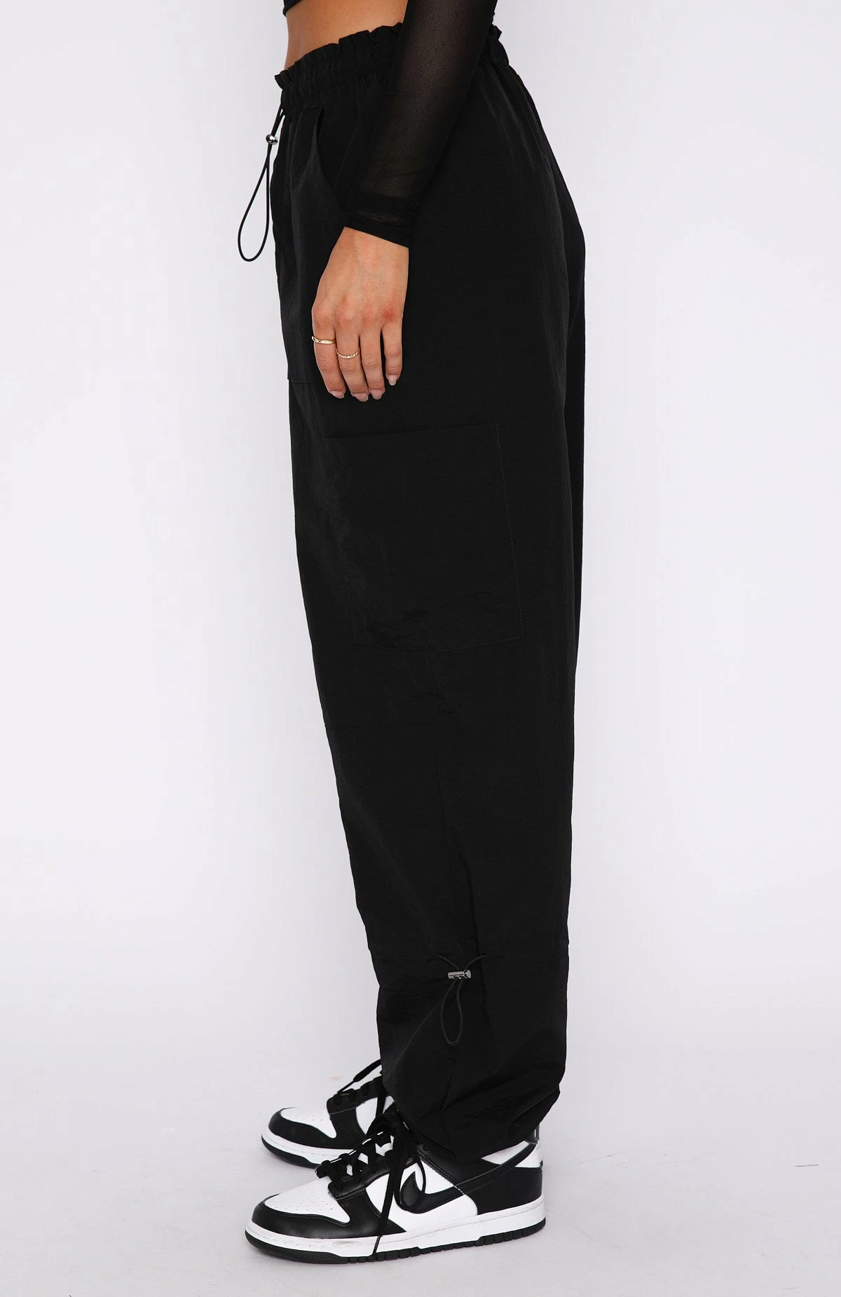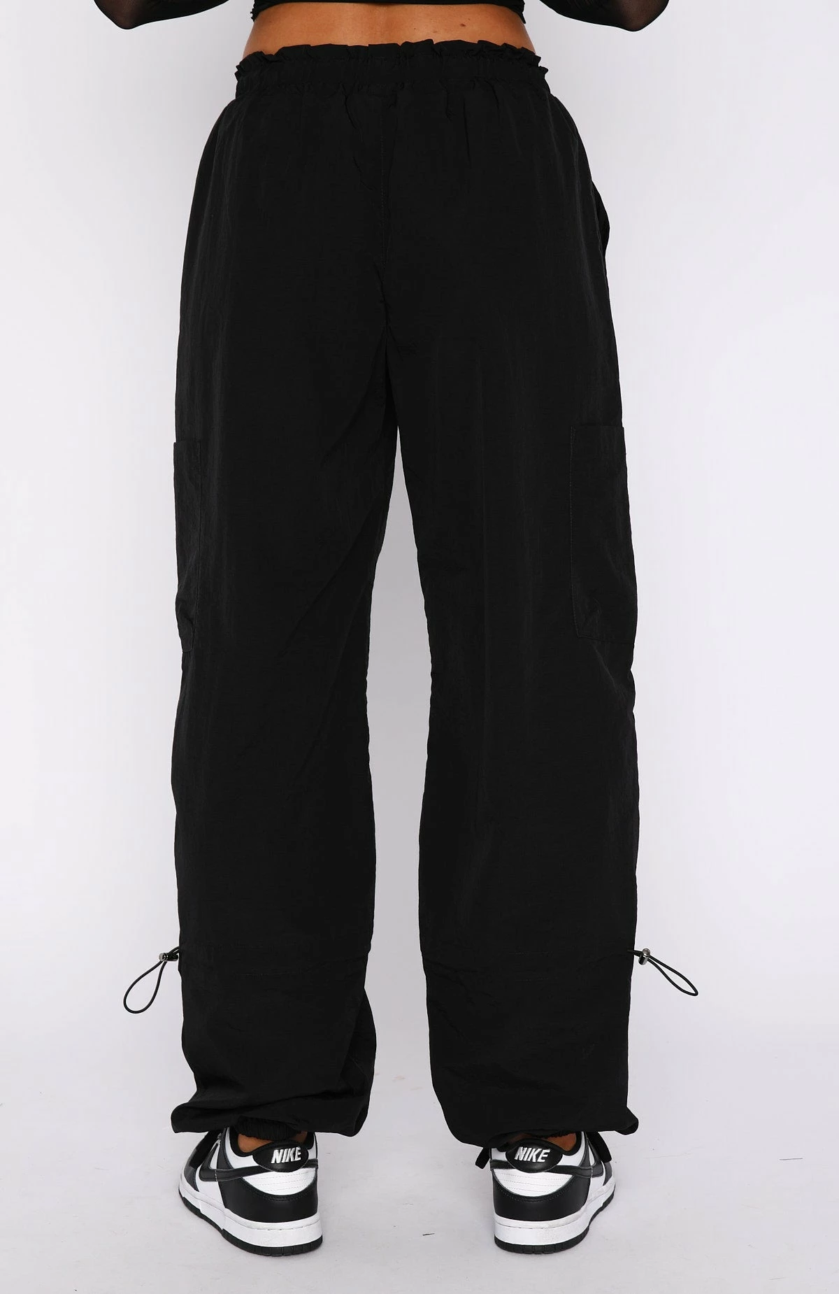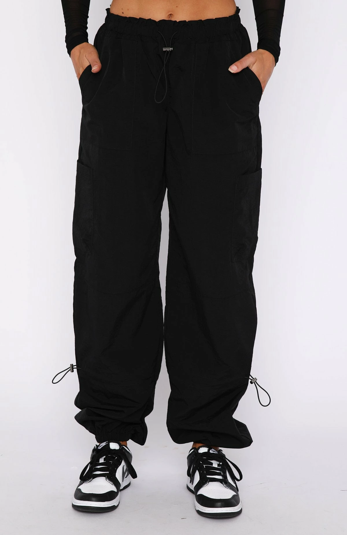 Create unforgettable looks in the Never Blend In Cargo Pants in Black. Featuring a parachute pant design and a wide leg fit, drawstring with toggle, elasticated waistband and cuffs, side pocket design on legs and lightweight fabric. Pair these parachute pants with a long sleeve top and sneakers for a super chic look.
