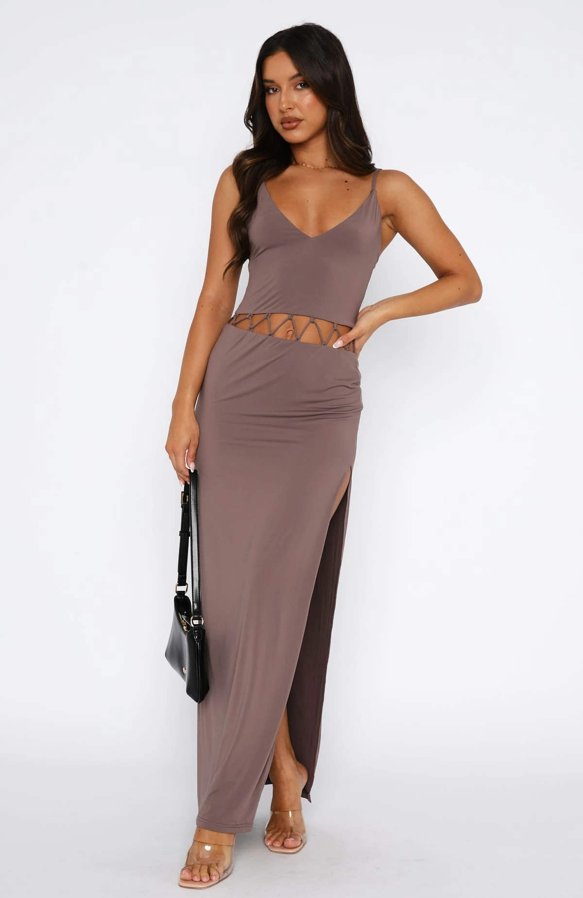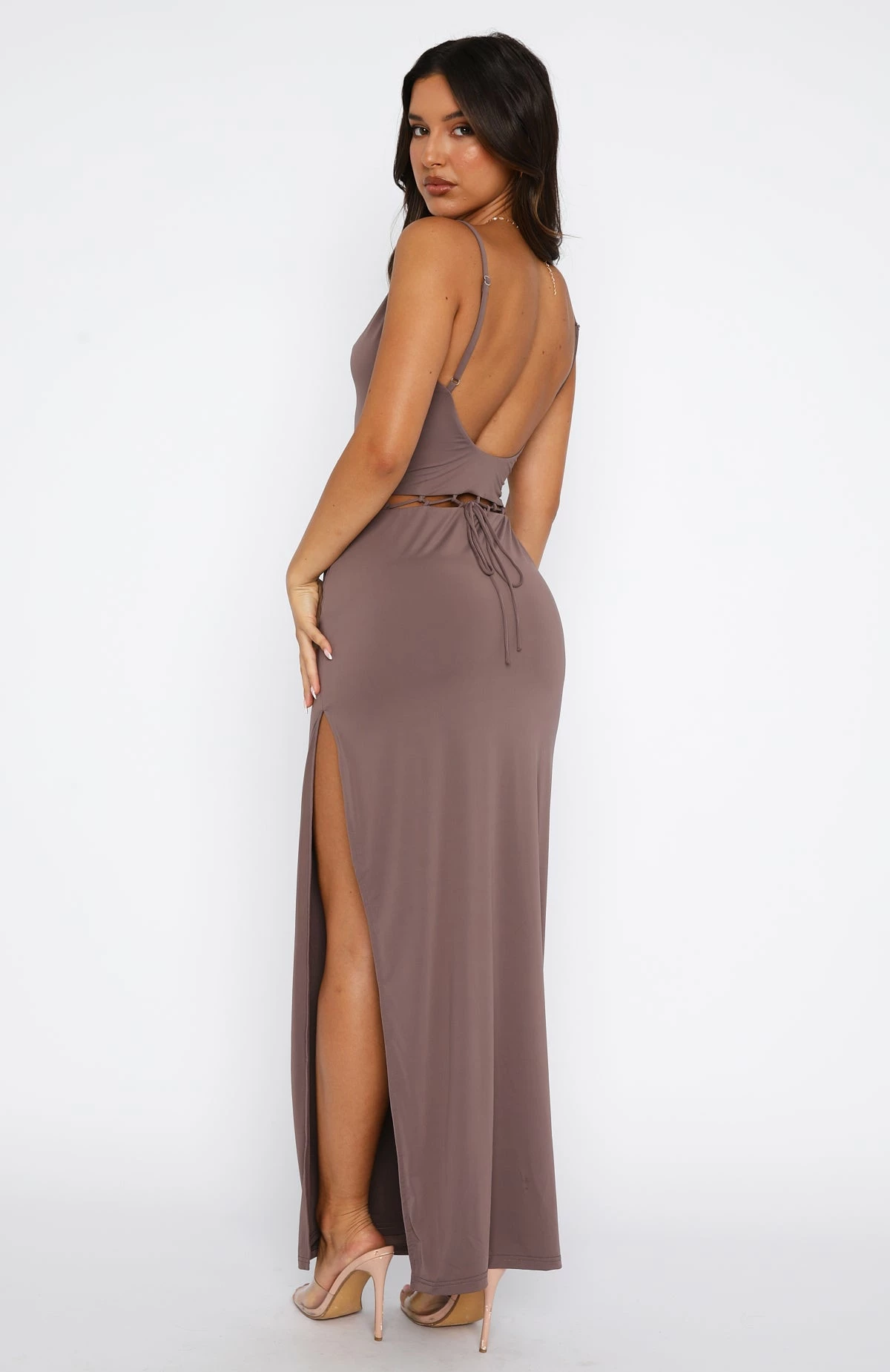 The New Type Maxi Dress Pewter features a low-cut neckline, backless, thin adjustable straps, high cut side split hem, mid-waist cut out design with cross-over and adjustable ties, lined and super soft silky fabric. Slip on and attend your next event feeling gorgeous and feminine!
