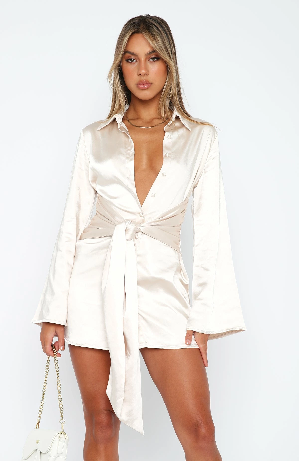 The Night Out Long Sleeve Mini Dress in Champagne speaks for itself. Featuring collared neckline, long sleeves, button-up front closure, front-tie design and lined, silk-feel fabric. Pair with gold accessories and perspex heels and get ready to be best dressed at your next event!