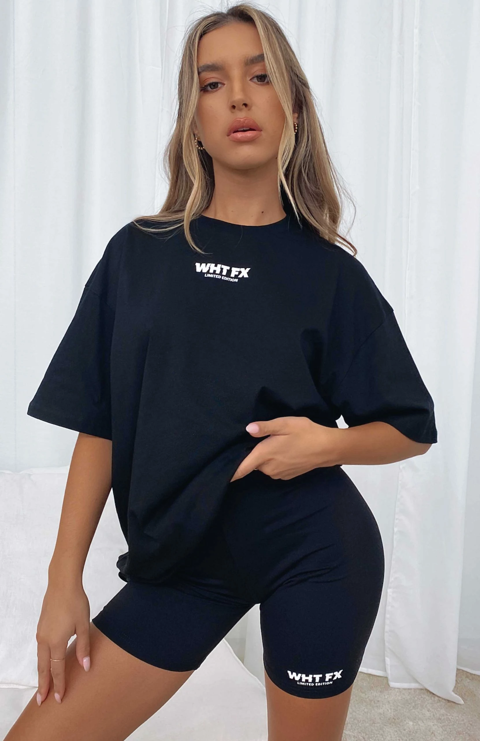 Update your everyday t-shirt collection with our No Afterthought Tee in Black. This top is oversized with a high scooped neckline, slouch shoulders, and printed logo centre front. Complete the matching set with our Just In Bike Shorts for the ultimate sports luxe look.