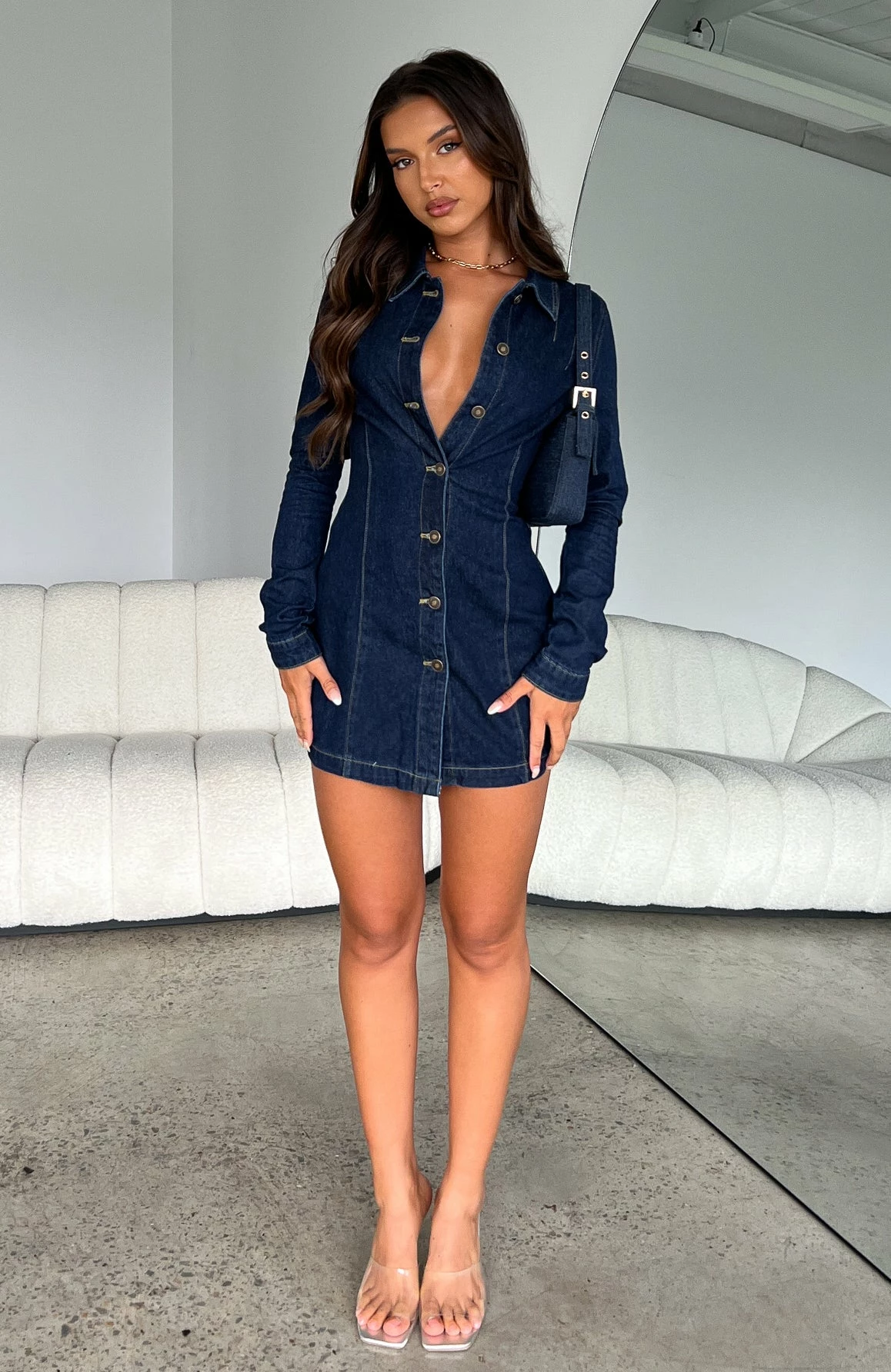 Channel your inner It Girl with the No Better Time Long Sleeve Mini Dress Deep Blue! Featuring collared neckline, front and cuff button closure, fitted waist design and denim fabric. We love this paired with knee-high boots and sunglasses for a cool girl fit!