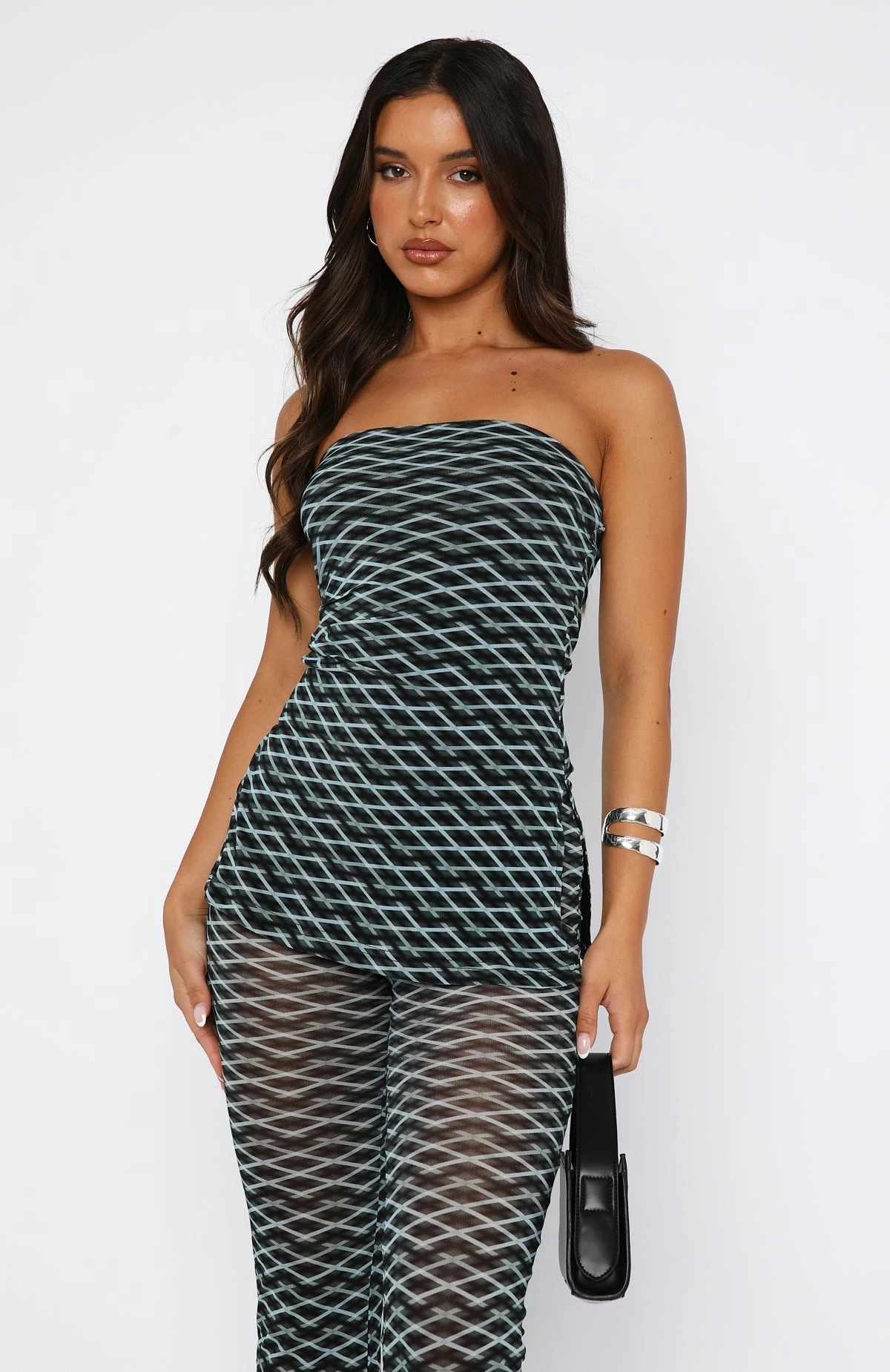 Make a statement in the No Vacancy Top Aqua Argyle, cut from a mesh fabric in and strapless and fitted silhouette. Features a strapless fit, ruched side design, grip tape, full length with side split design, lined and gorgeous printed fabric. Looks best paired with the matching No Vacancy Pants!