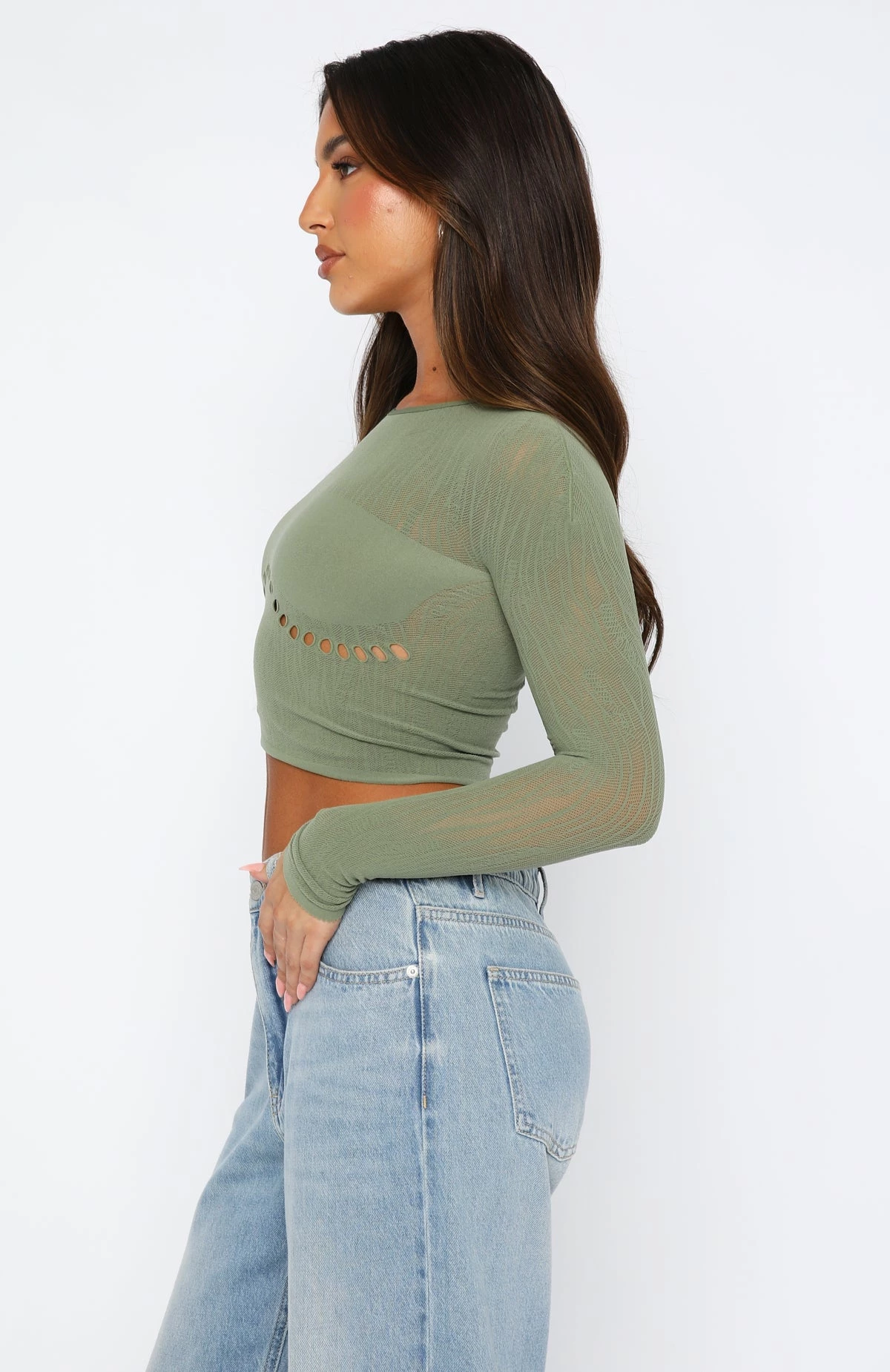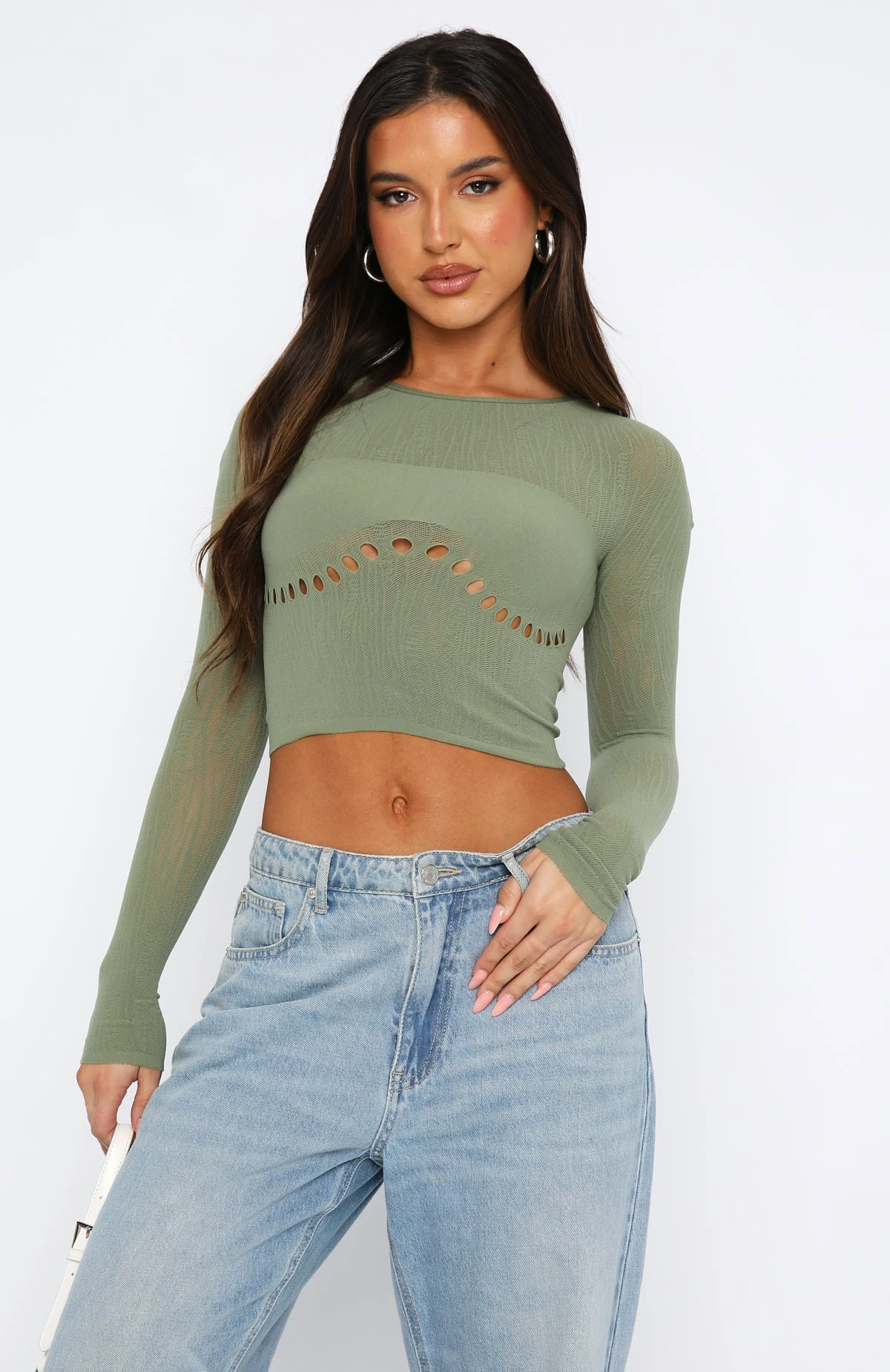 This Not In My Plans Long Sleeve Top in Khaki is the answer to all your what-to-wear dilemmas. Featuring long sleeves, high neckline with diamanté detail and delicate sheer, stocking fabric with stretch so one size fits most. We love this paired with the Gwen Diamante Bag and clear mules for a look we are obsessed with!