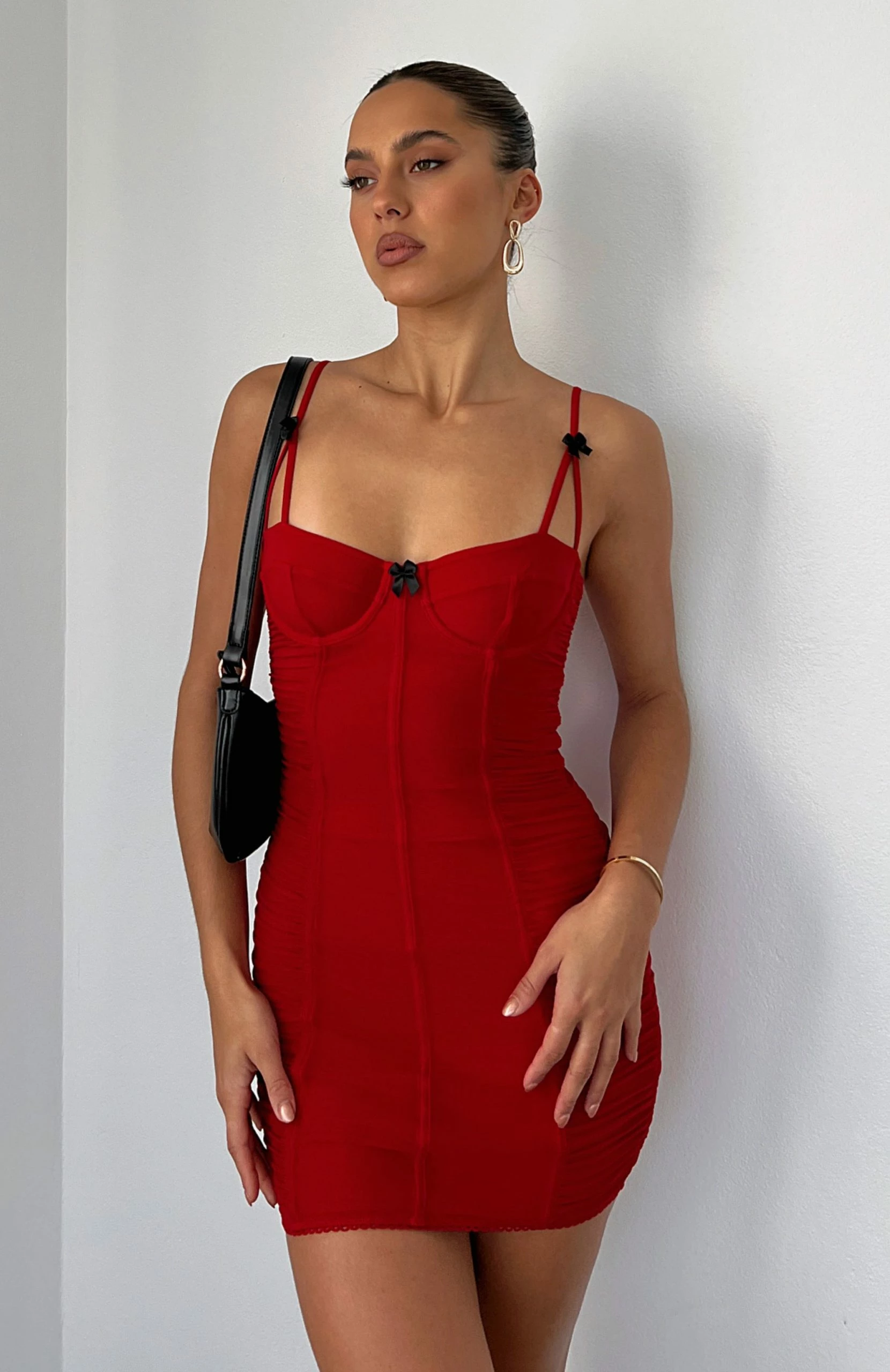 Turn heads in the On My Way Mini Dress in Red. Featuring thin, adjustable straps, bust underwire, bow charm detail, ruched side design, boning in bodice, invisible zipper centre back and lined, mesh stretch fabric. Pair with gold accessories and perspex heels and you are ready for your night out with the girls!