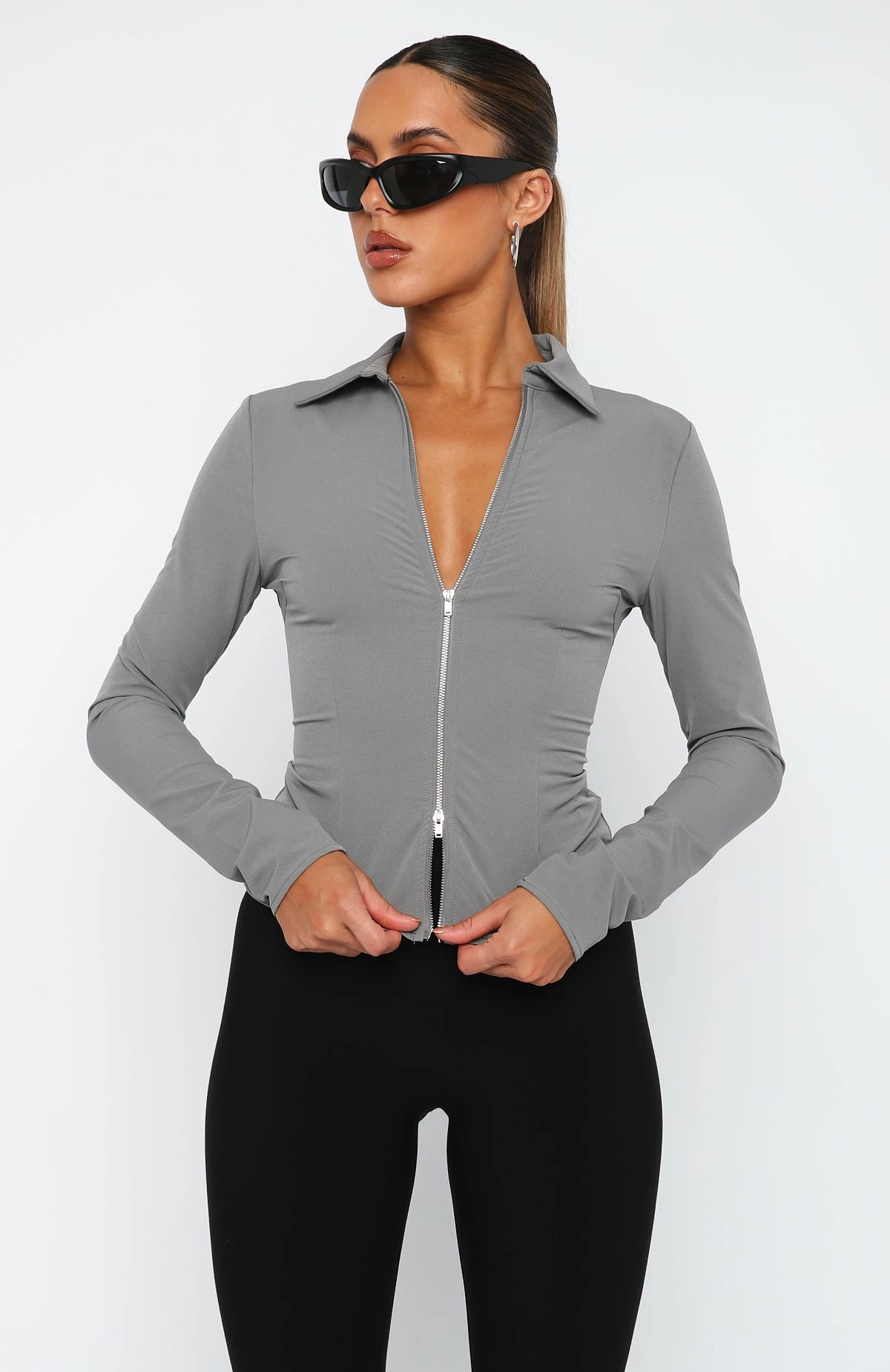 The One Moment Long Sleeve Top in Grey is the elevated basic your wardrobe needs! Featuring collared neckline and front zipper closure. This top can be styled multiple ways! We love this dressed up with a cute mini skirt and heels or dressed down with leggings! The options are endless!