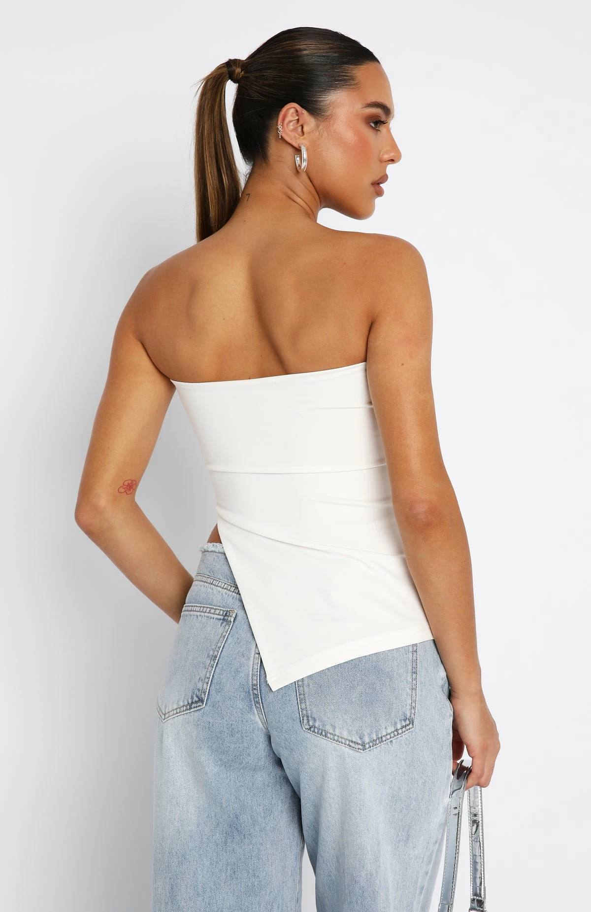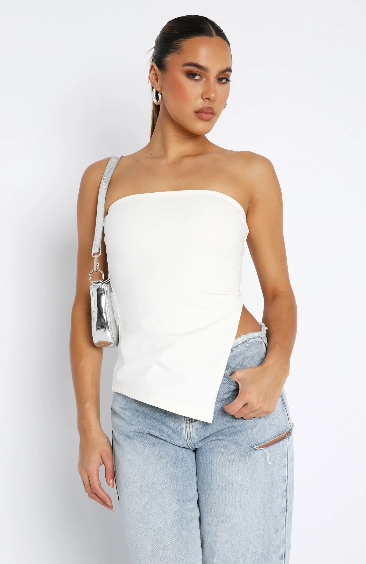 It’s the perfect blend of comfort and style — slip it on for a day at the office, then dinner and drinks. The One More Night Strapless Top White features a strapless fit, grip tape, asymmetric side split design, mesh lined fabric and semi cropped length.