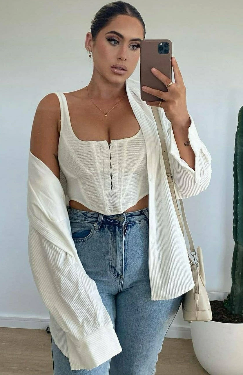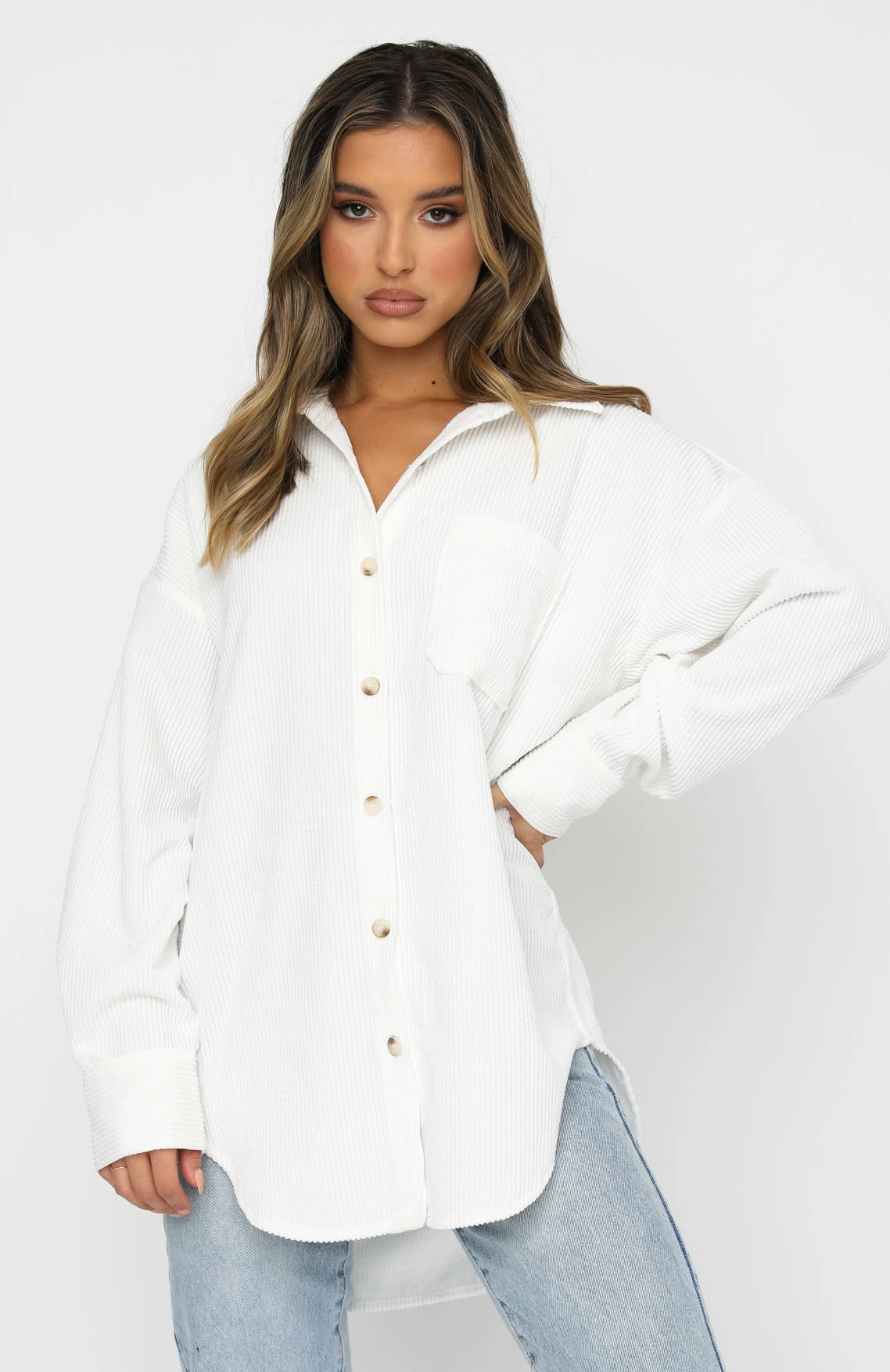 Work your styling techniques to dress the Out And About Long Sleeve Shirt in White up or down. Featuring a cord material with button fastenings, buttoned cuffs and an oversized fit. Team this with a white crop top and denim jeans for a look we’re loving.