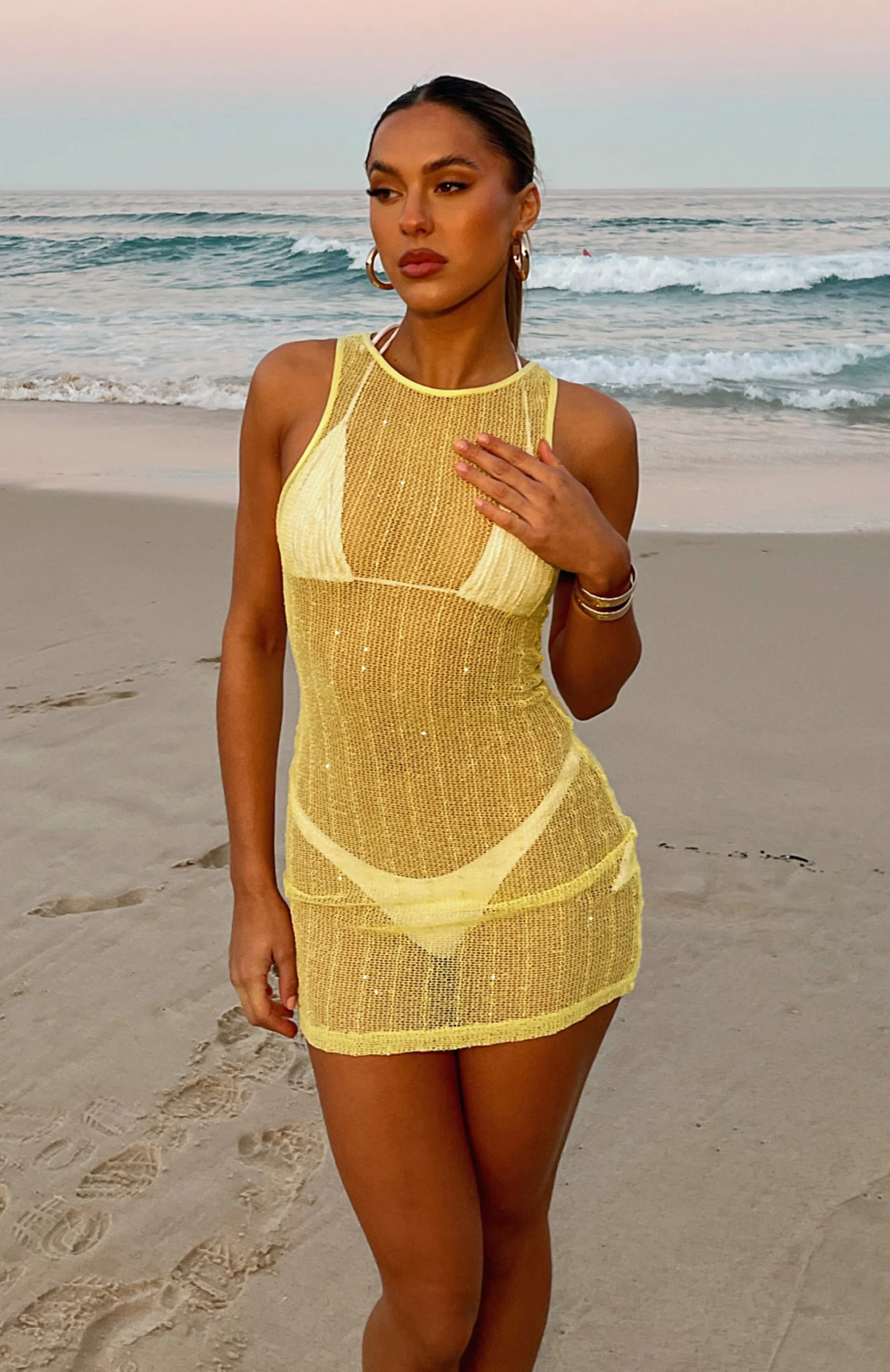 We wanted to create the perfect summer slip dress and here she is. The Over Him Mini Dress Lemon features a high neckline, sheer knit fabric, mini length and back button closure. Pair this with your favourite White Fox Swim and slides for a perfect summers day